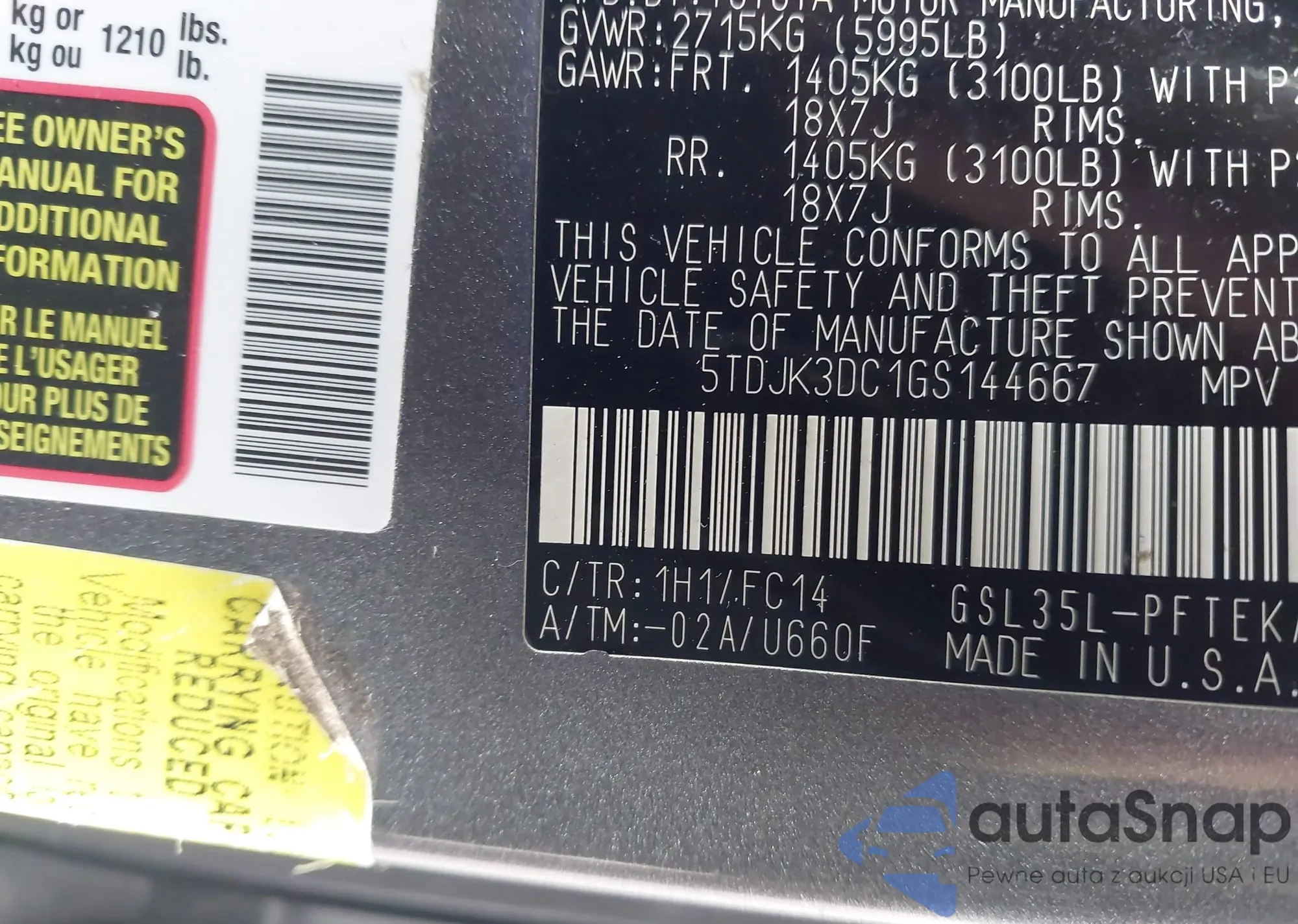 LOT: 43697033 VIN: 5TDJK3DC1GS144667
