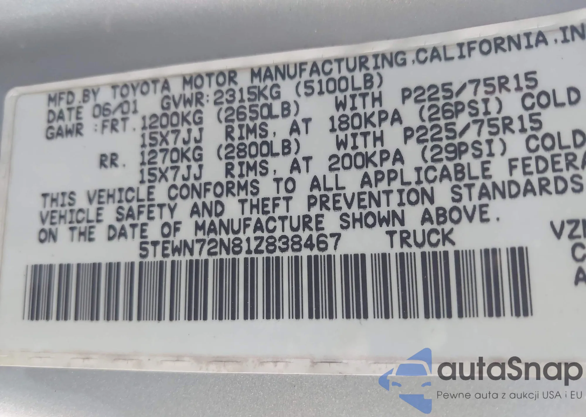 • VIN 5TEWN72N81Z838467