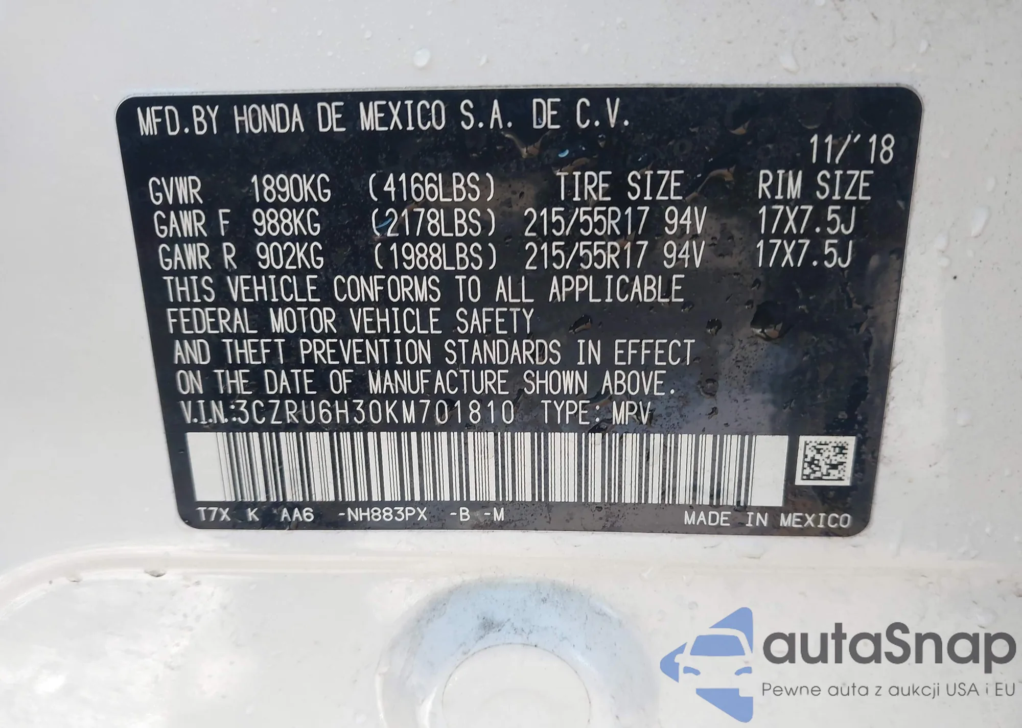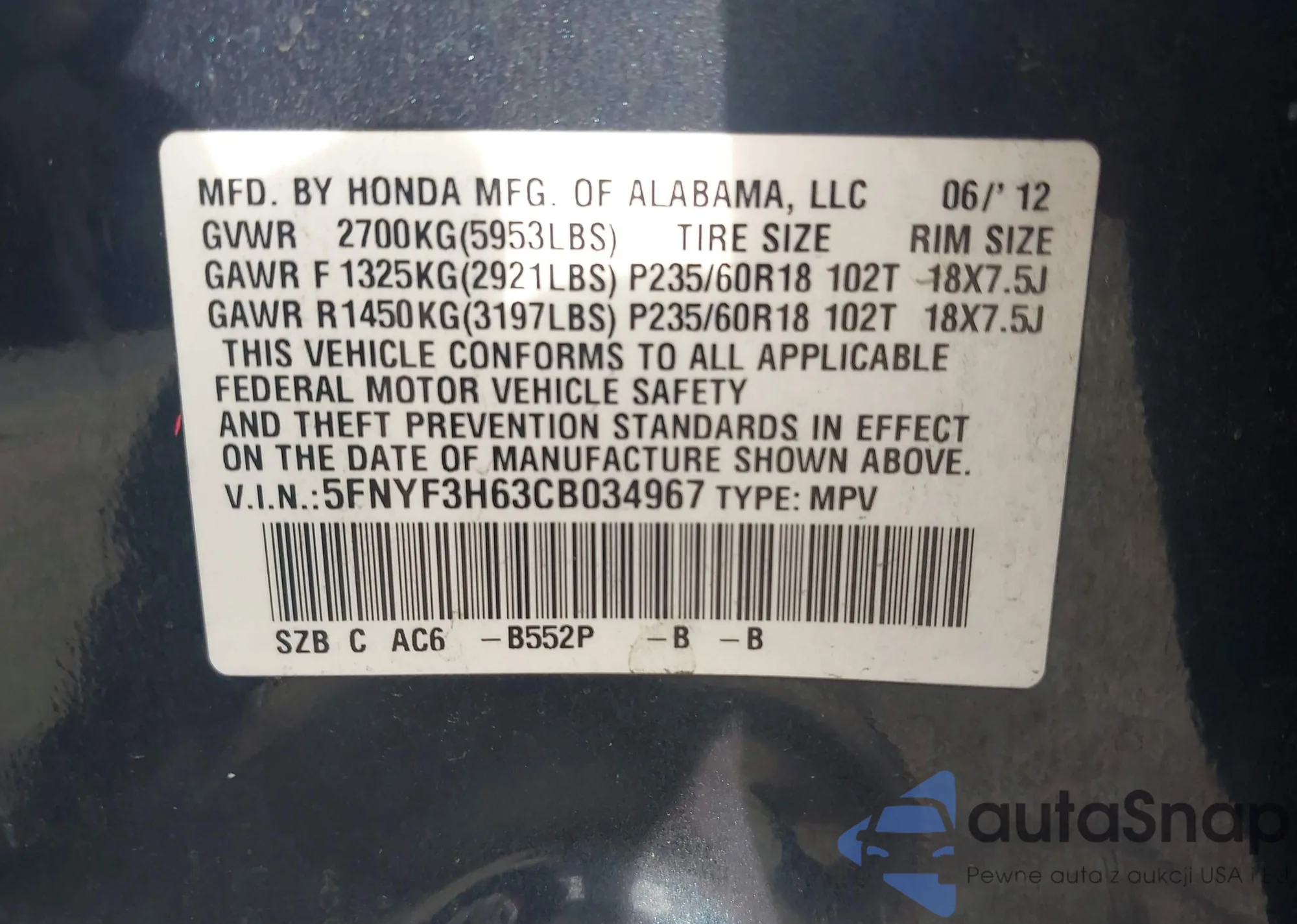• VIN 5FNYF3H63CB034967