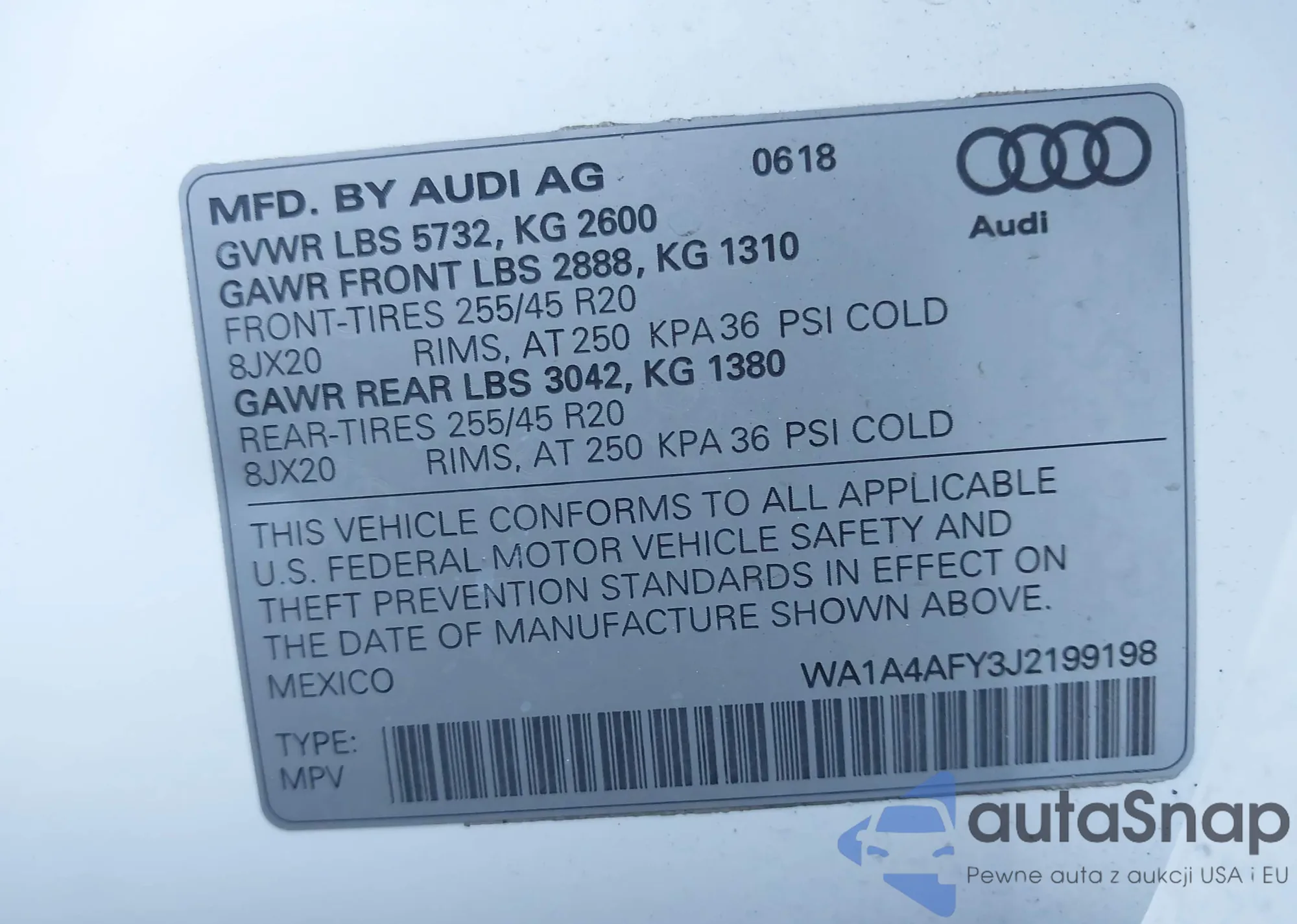 LOT: 43471583 VIN: WA1A4AFY3J2199198