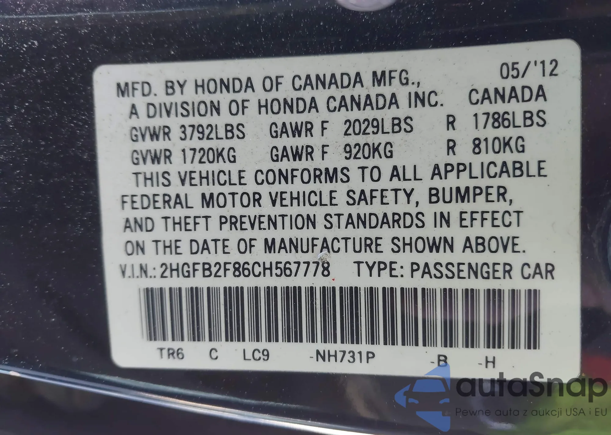 • VIN 2HGFB2F86CH567778