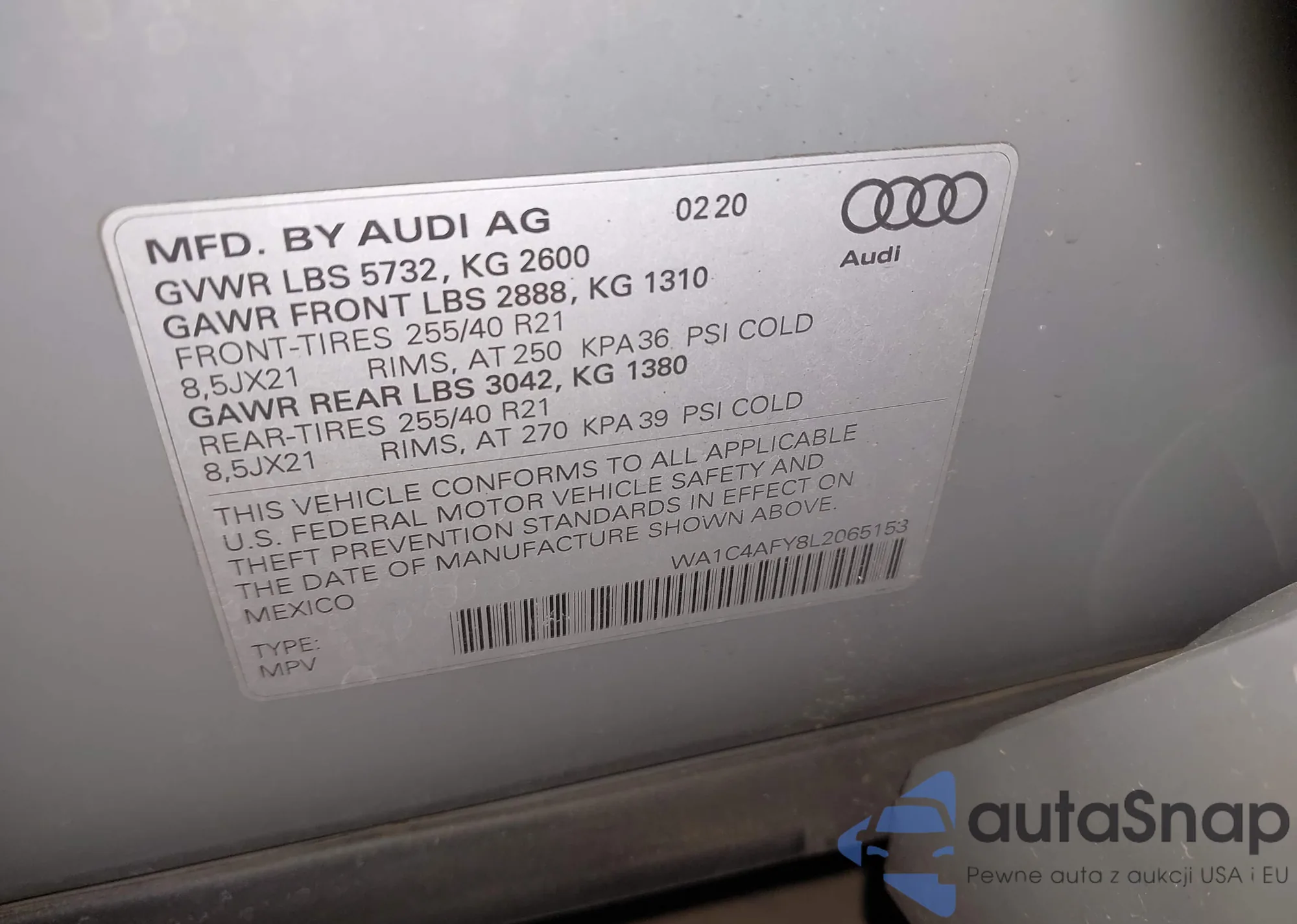 LOT: 43441846 VIN: WA1C4AFY8L2065153