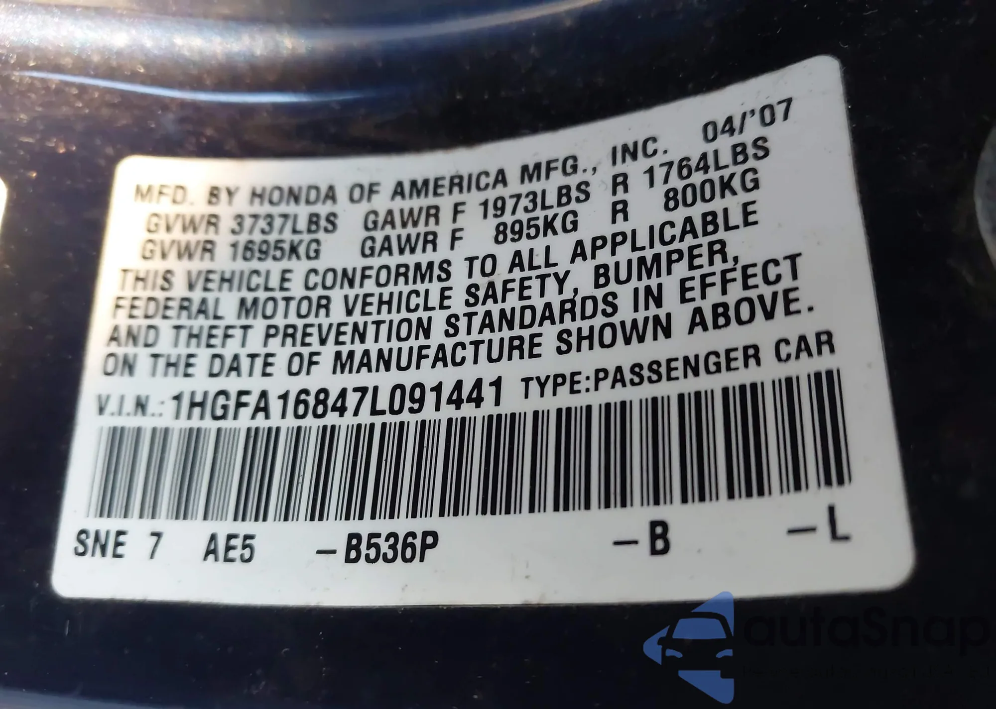 LOT: 43676975 VIN: 19XFC2F7XHE213106