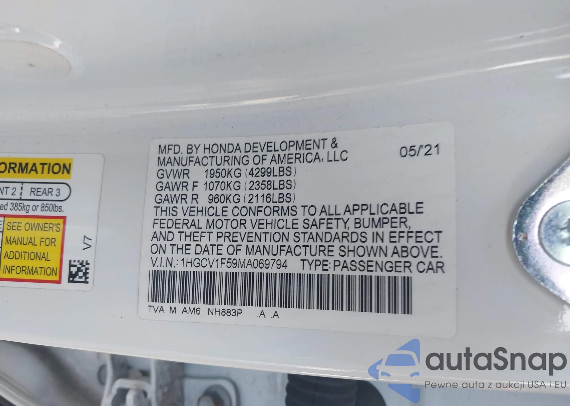 LOT: 43341766 VIN: 1HGCV1F59MA069794