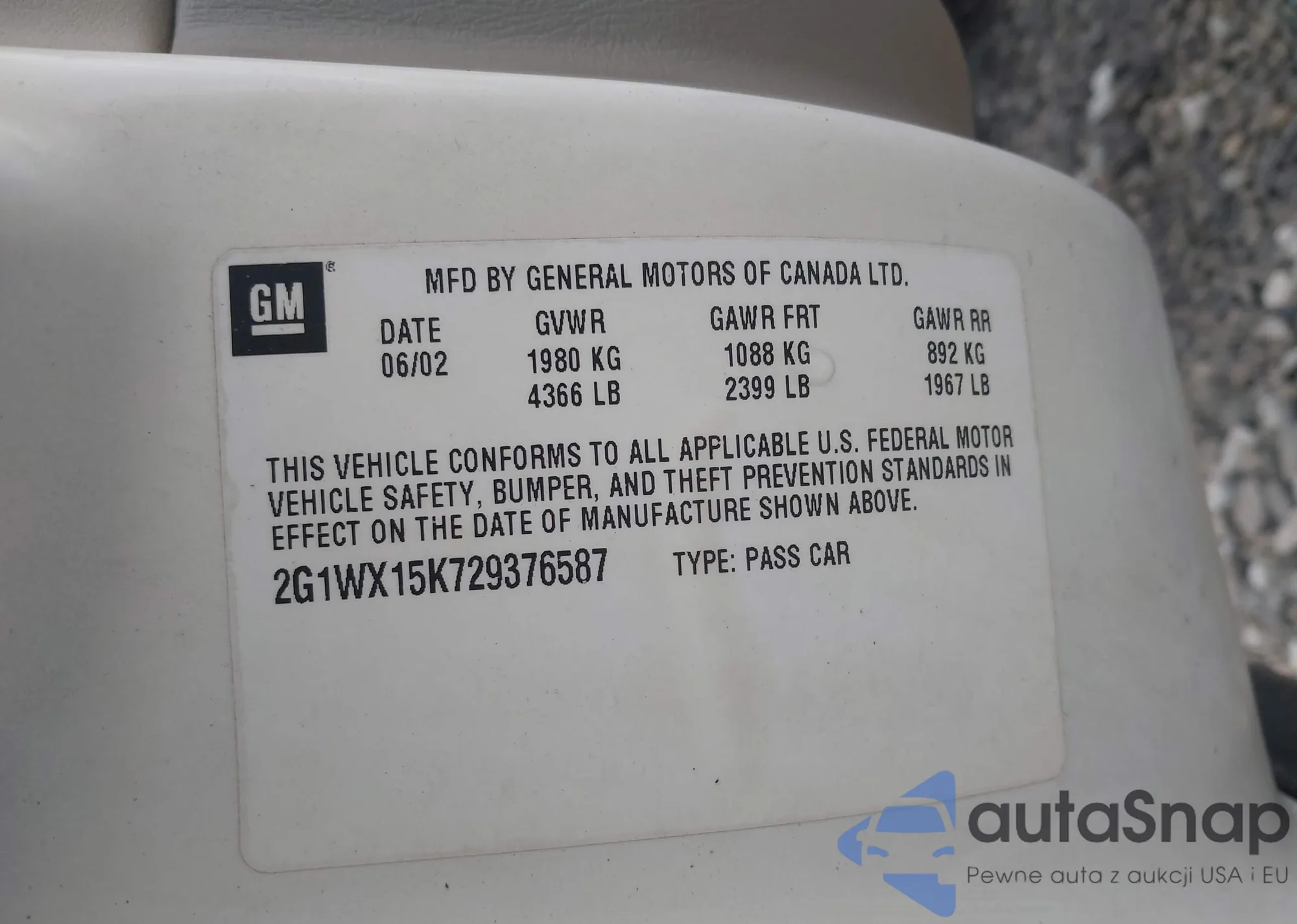 • VIN 2G1WX15K729376587