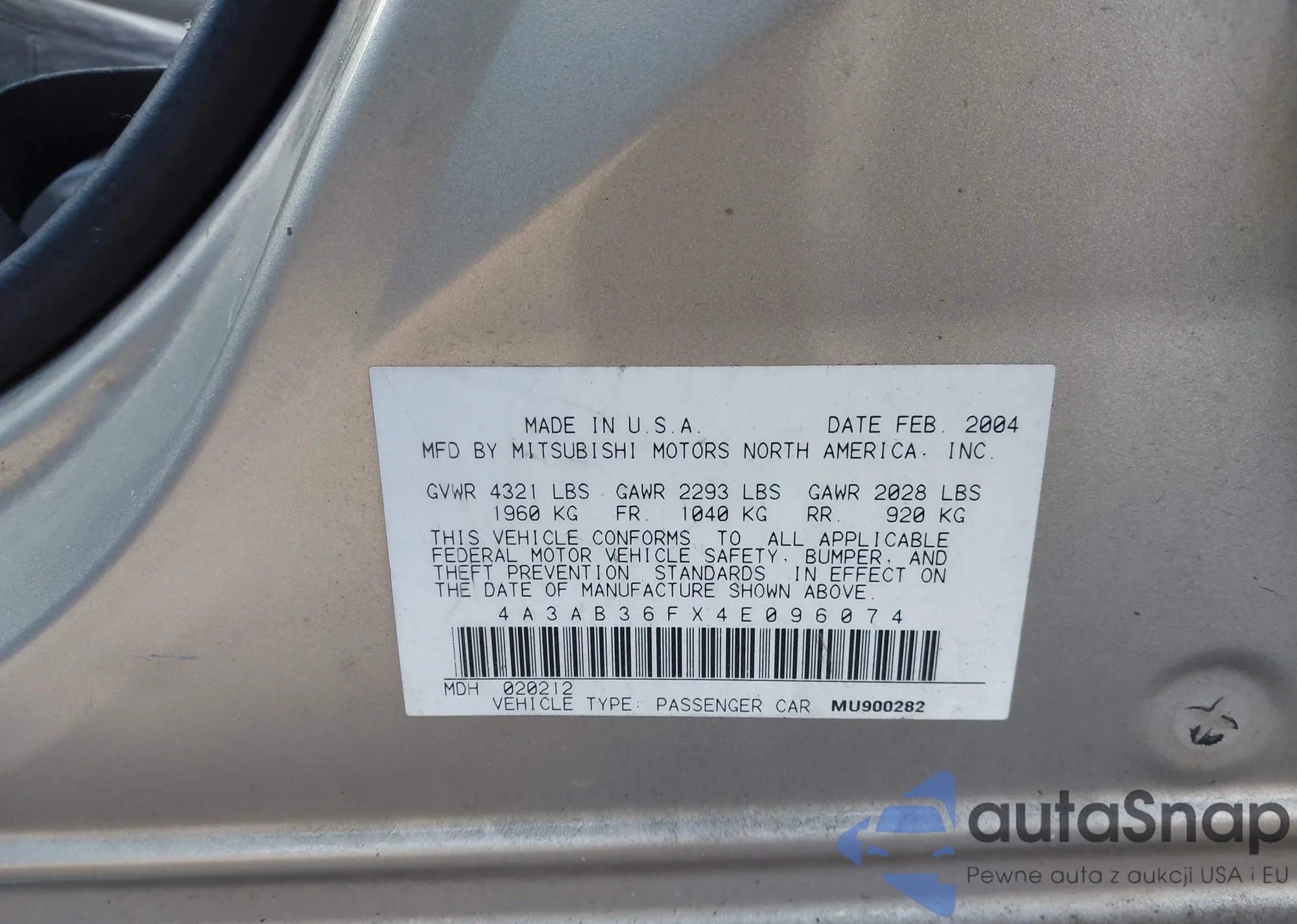 • VIN 4A3AB36FX4E096074
