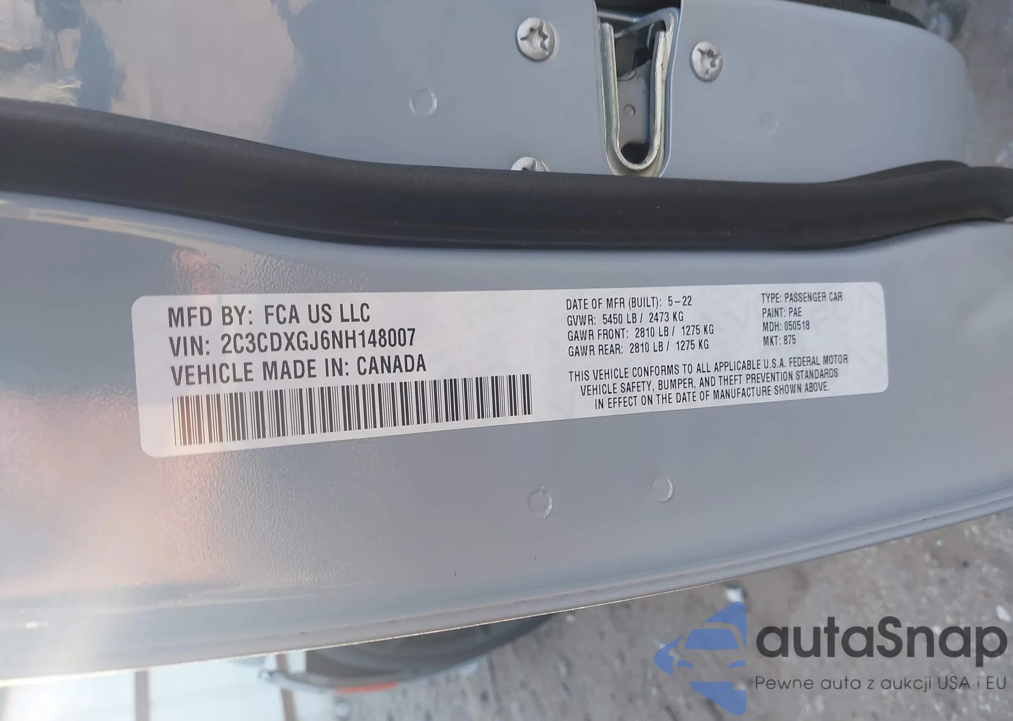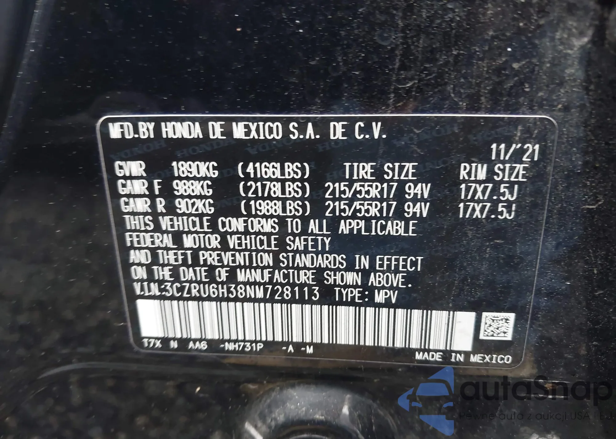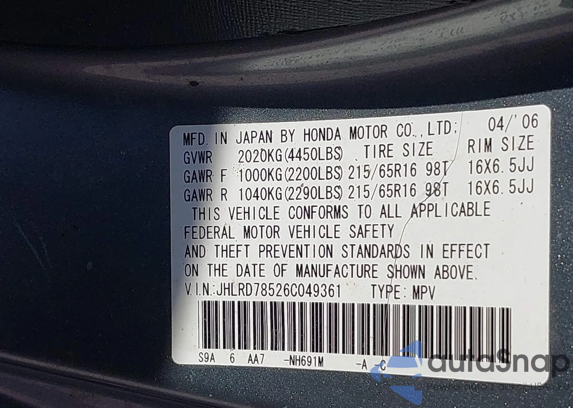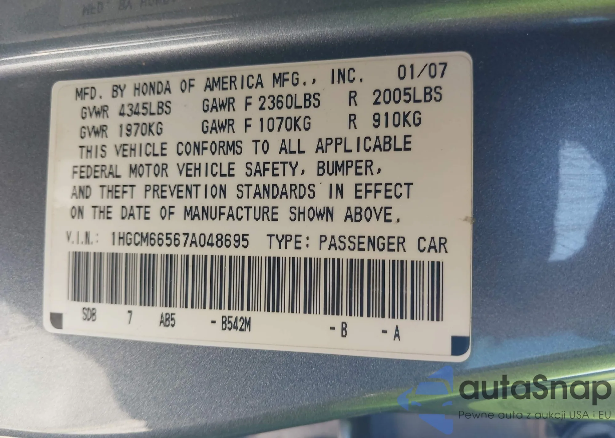 LOT: 43578339 VIN: 1HGCM66567A048695