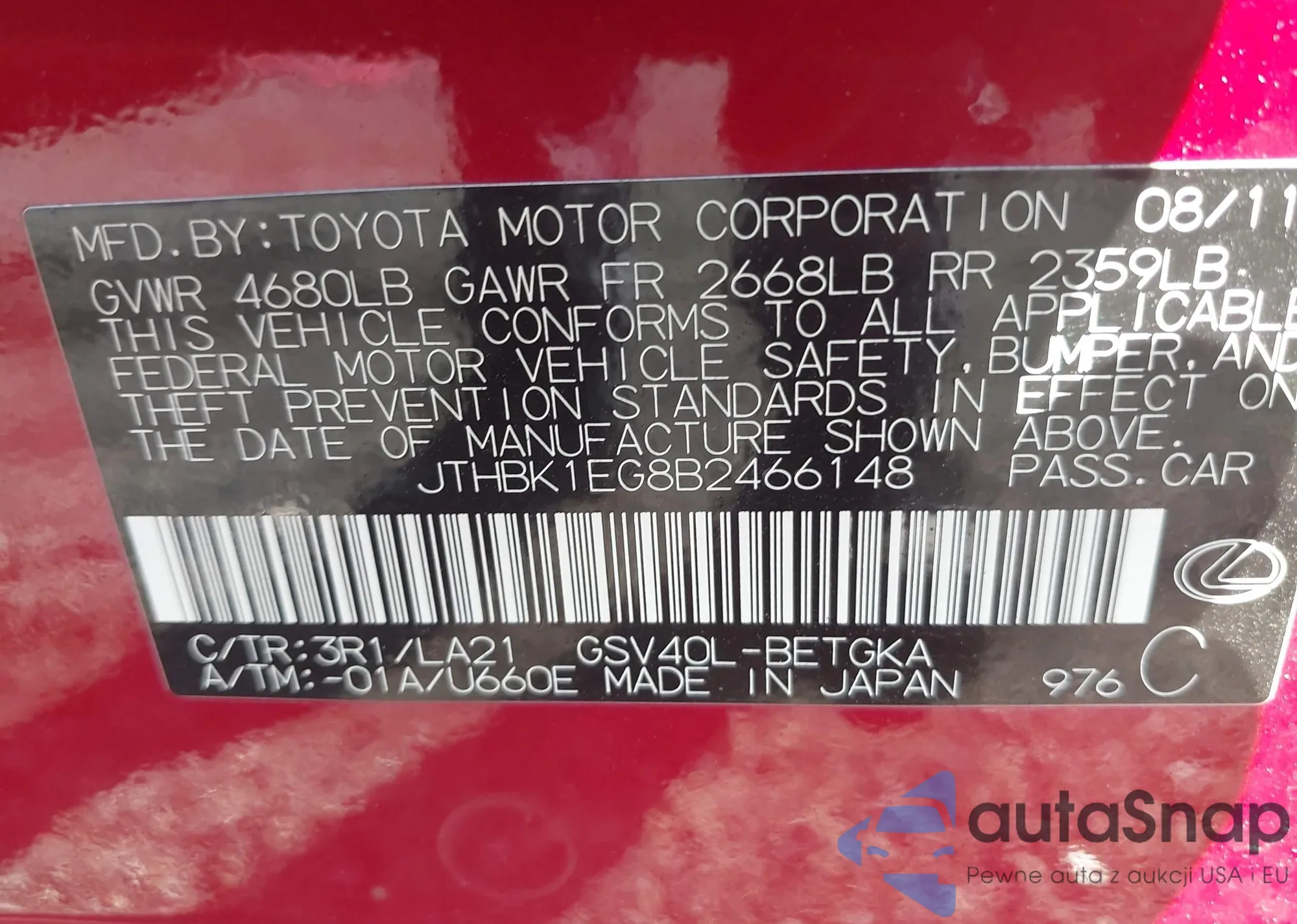 LOT: 43205059 VIN: JTHBK1EG8B2466148
