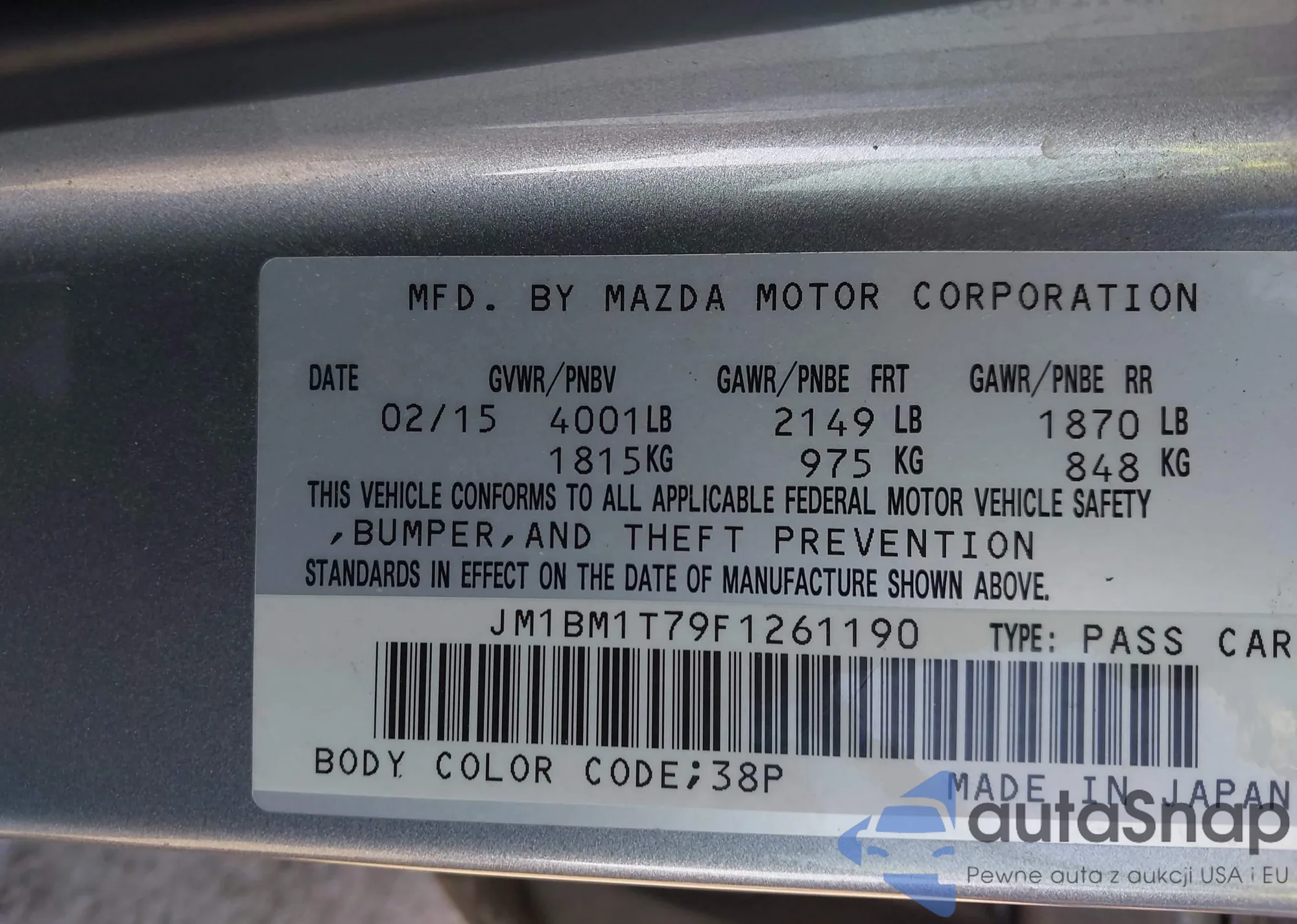 LOT: 43684238 VIN: JM1BM1T79F1261190