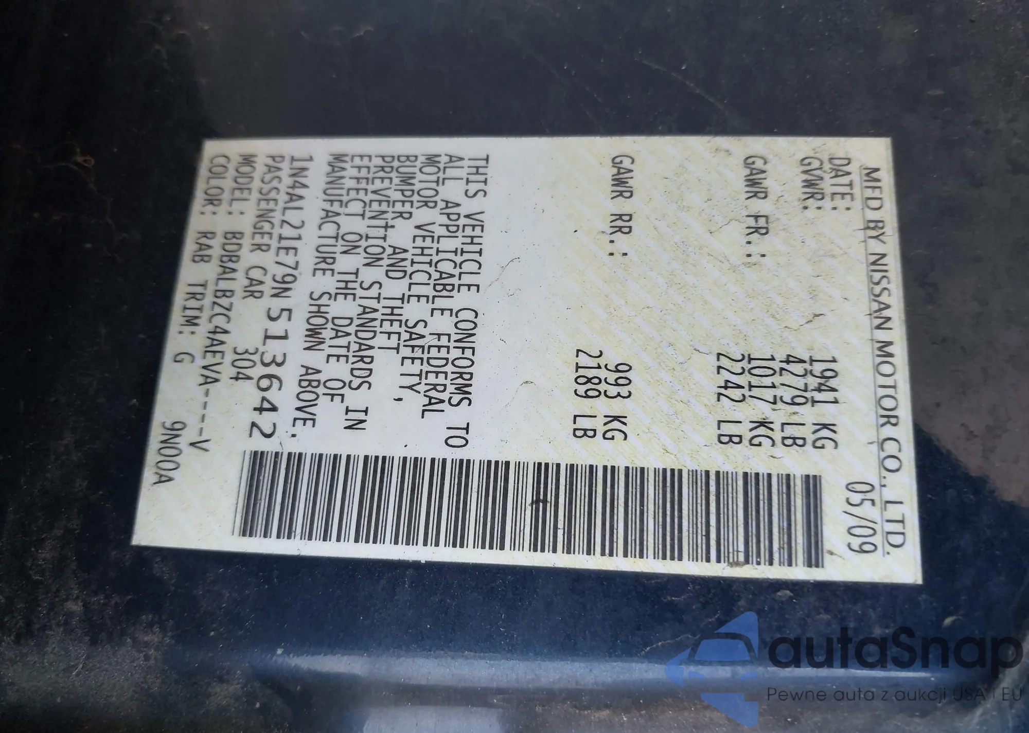 LOT: 43688412 VIN: 1N4AL21E79N513642