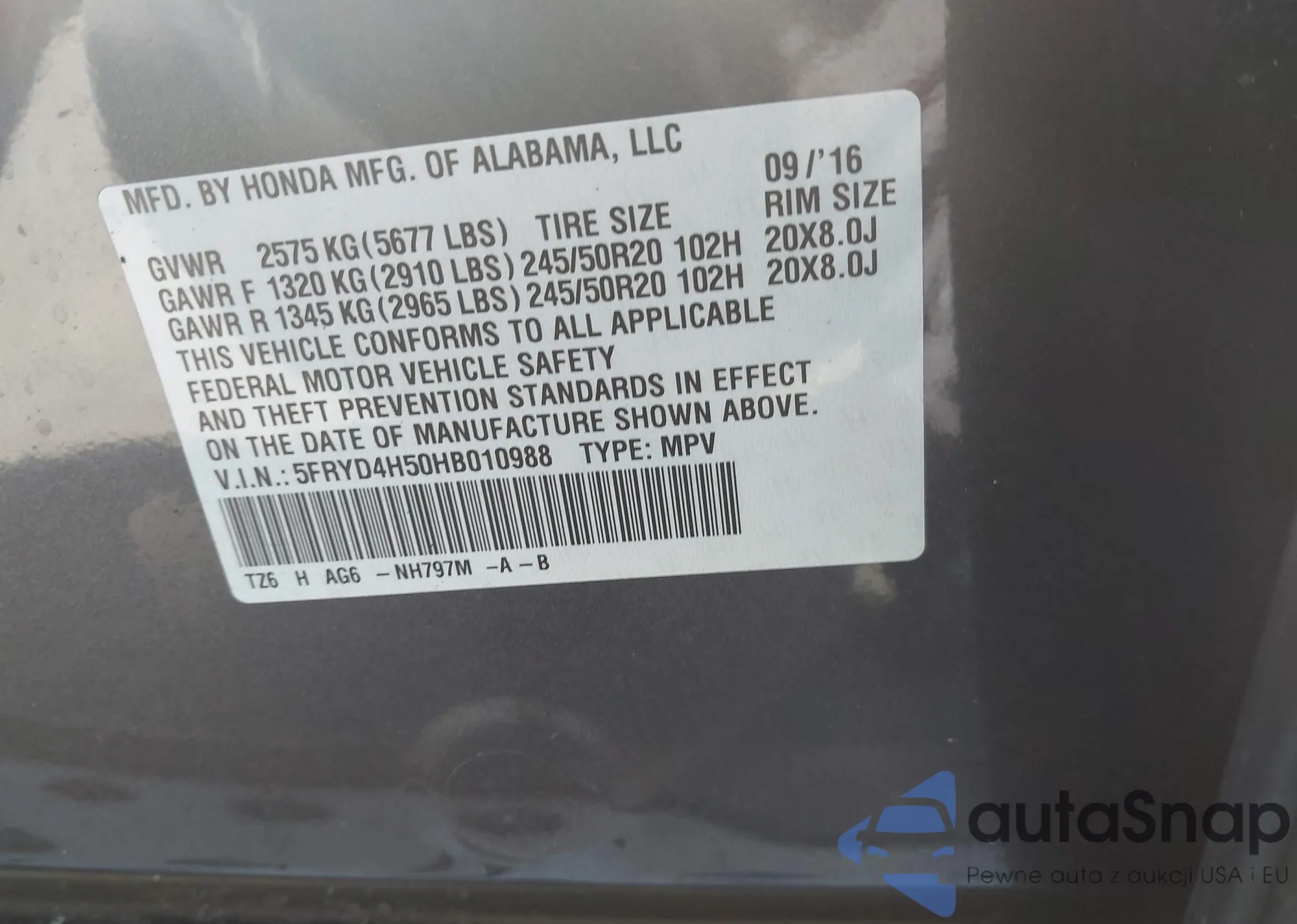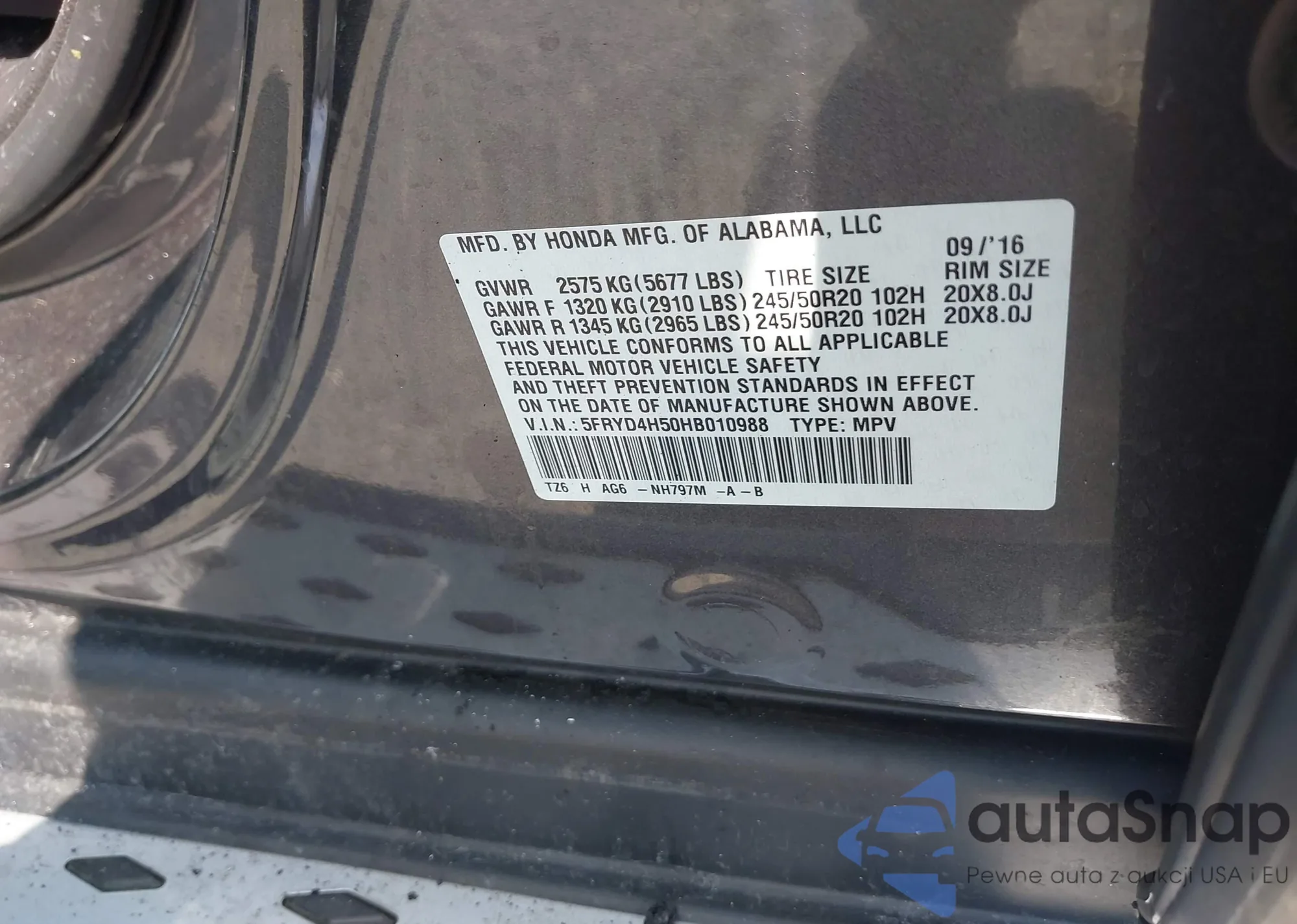 • VIN 5FRYD4H50HB010988