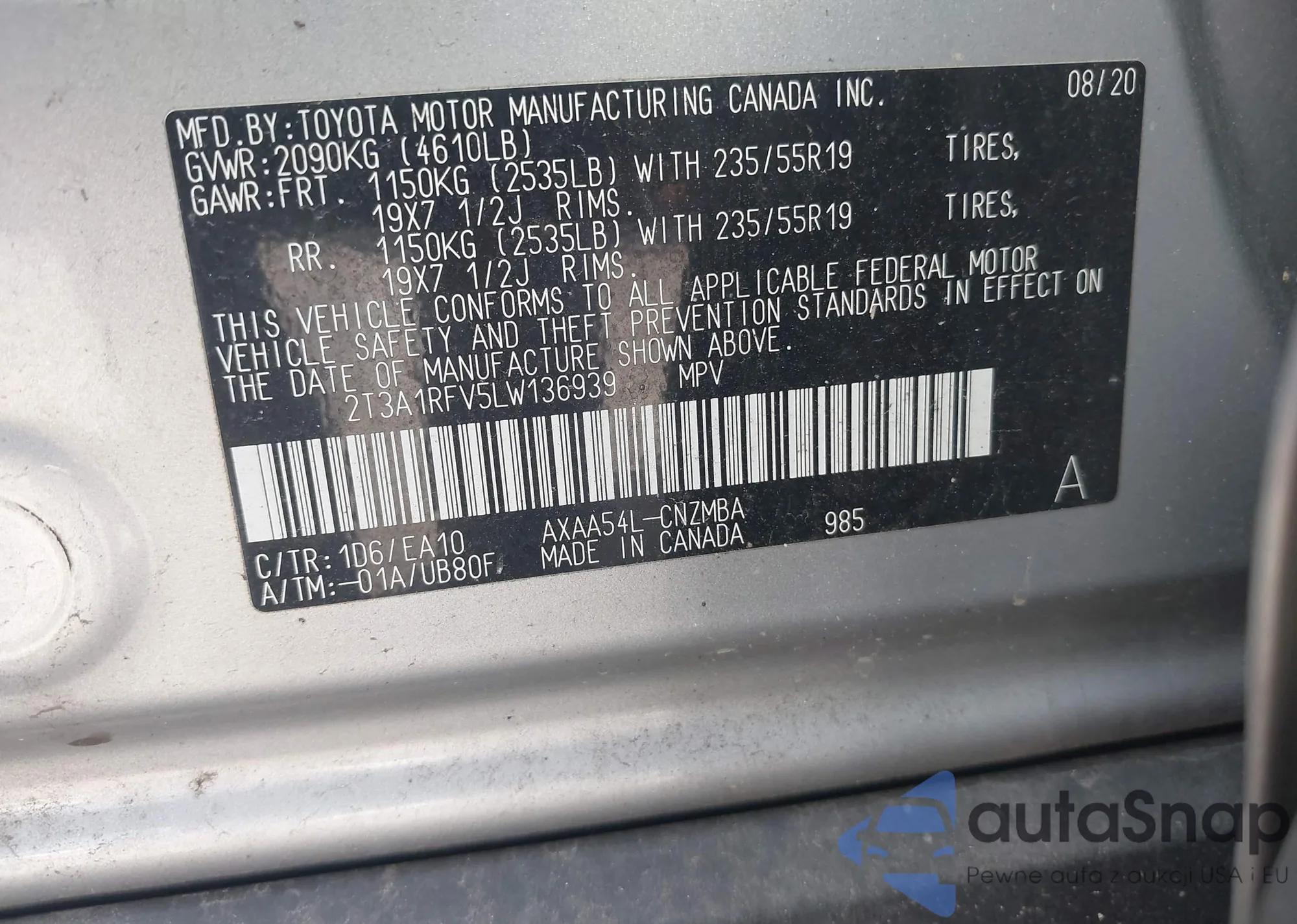 LOT: 43447759 VIN: 2T3A1RFV5LW136939