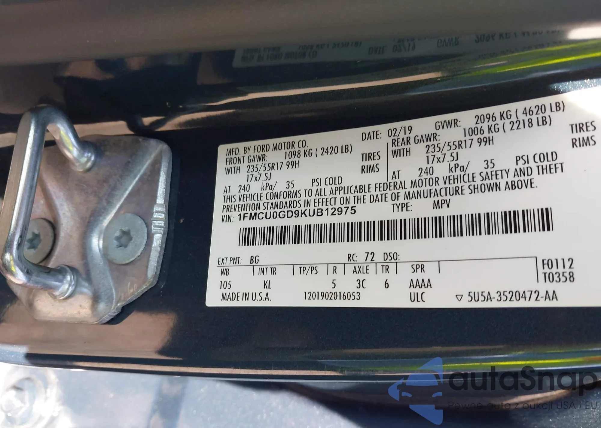 LOT: 43496283 VIN: 1FMCU0GD9KUB12975