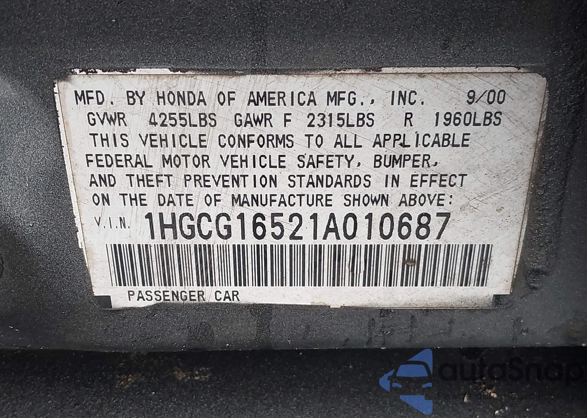 LOT: 43558837 VIN: 1HGCG16521A010687