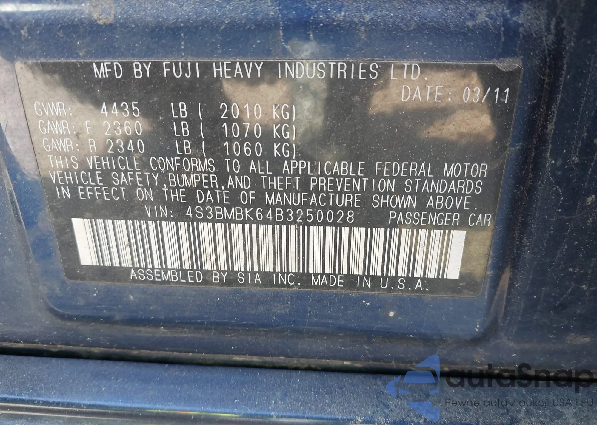 • VIN 4S3BMBK64B3250028