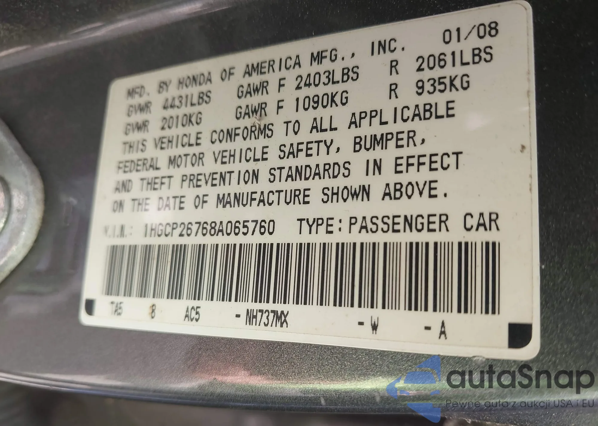 LOT: 42854725 VIN: 1HGCP26828A113862