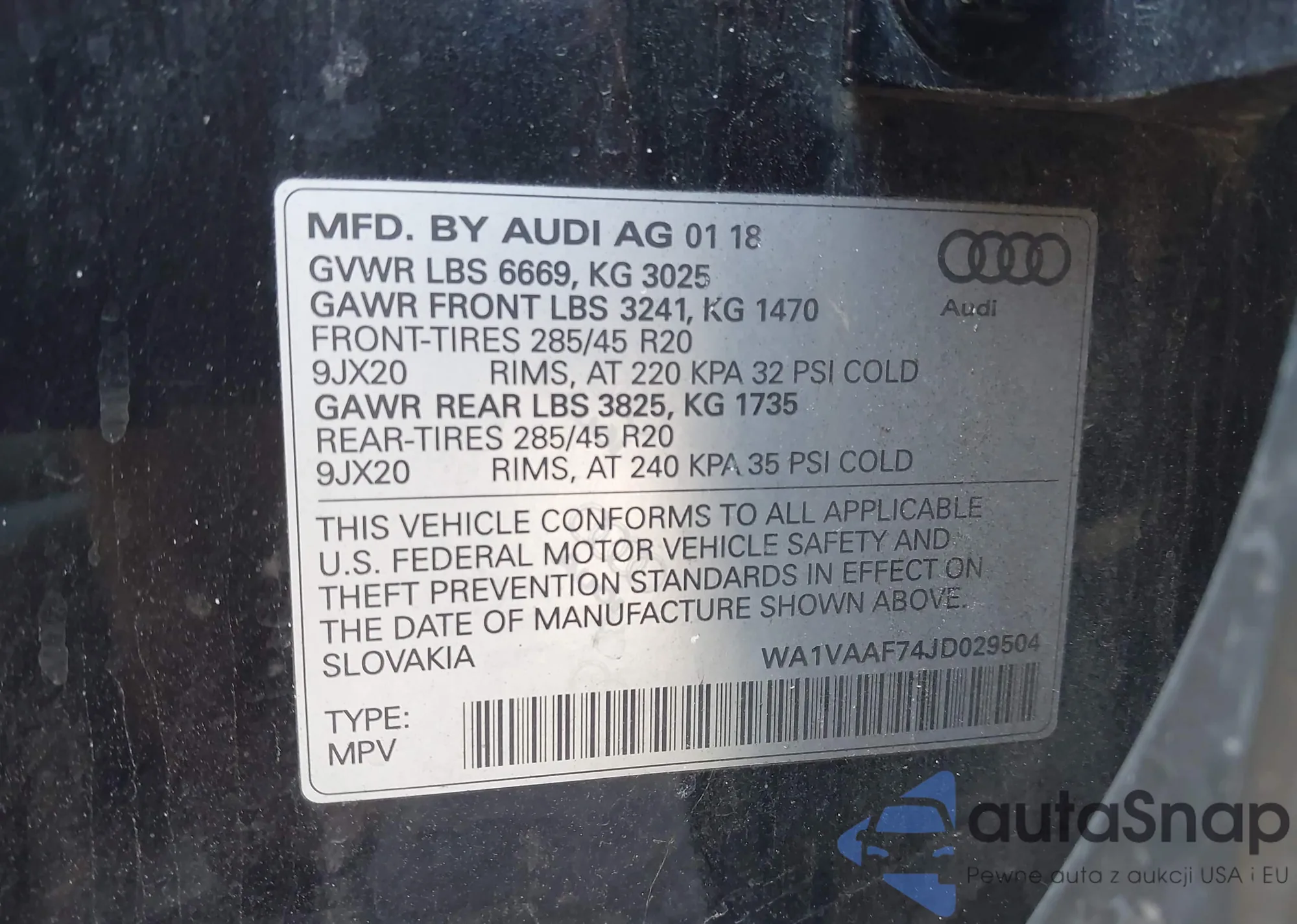LOT: 43450474 VIN: WA1VAAF74JD029504