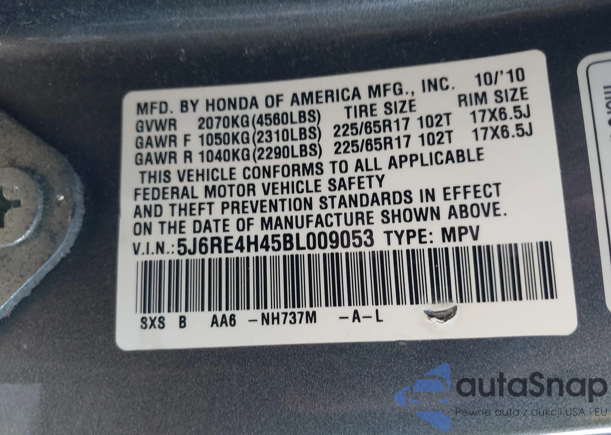 • VIN 5J6RE4H45BL009053