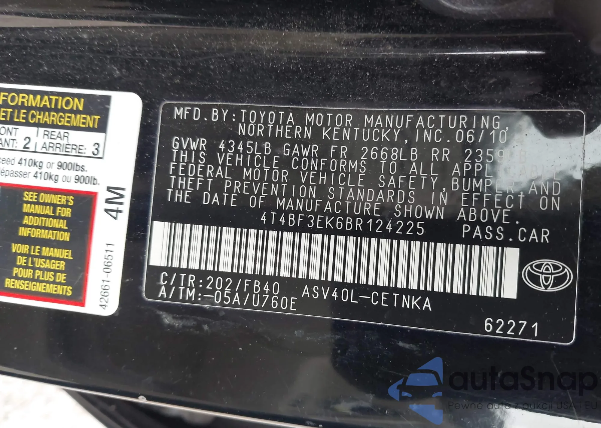 • VIN 4T4BF3EK6BR124225