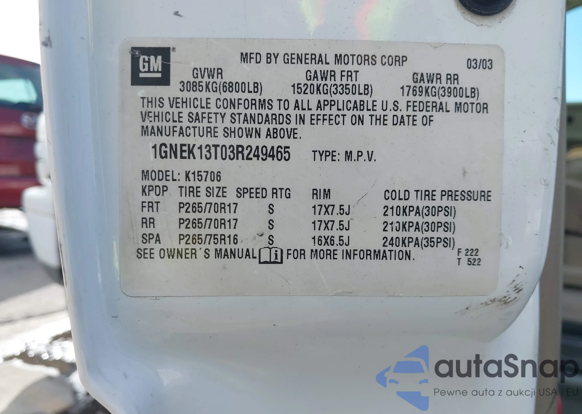 • VIN 1GNEK13T03R249465