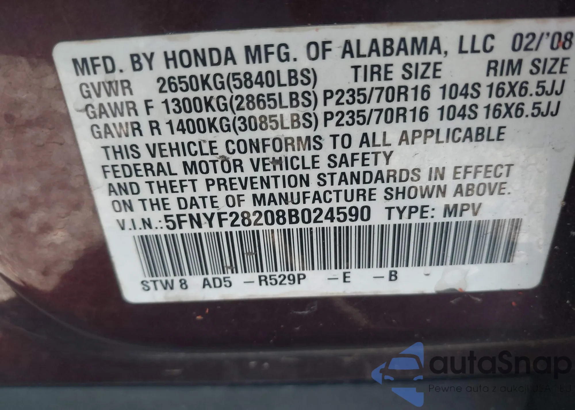 LOT: 43456097 VIN: 5FNYF28208B024590