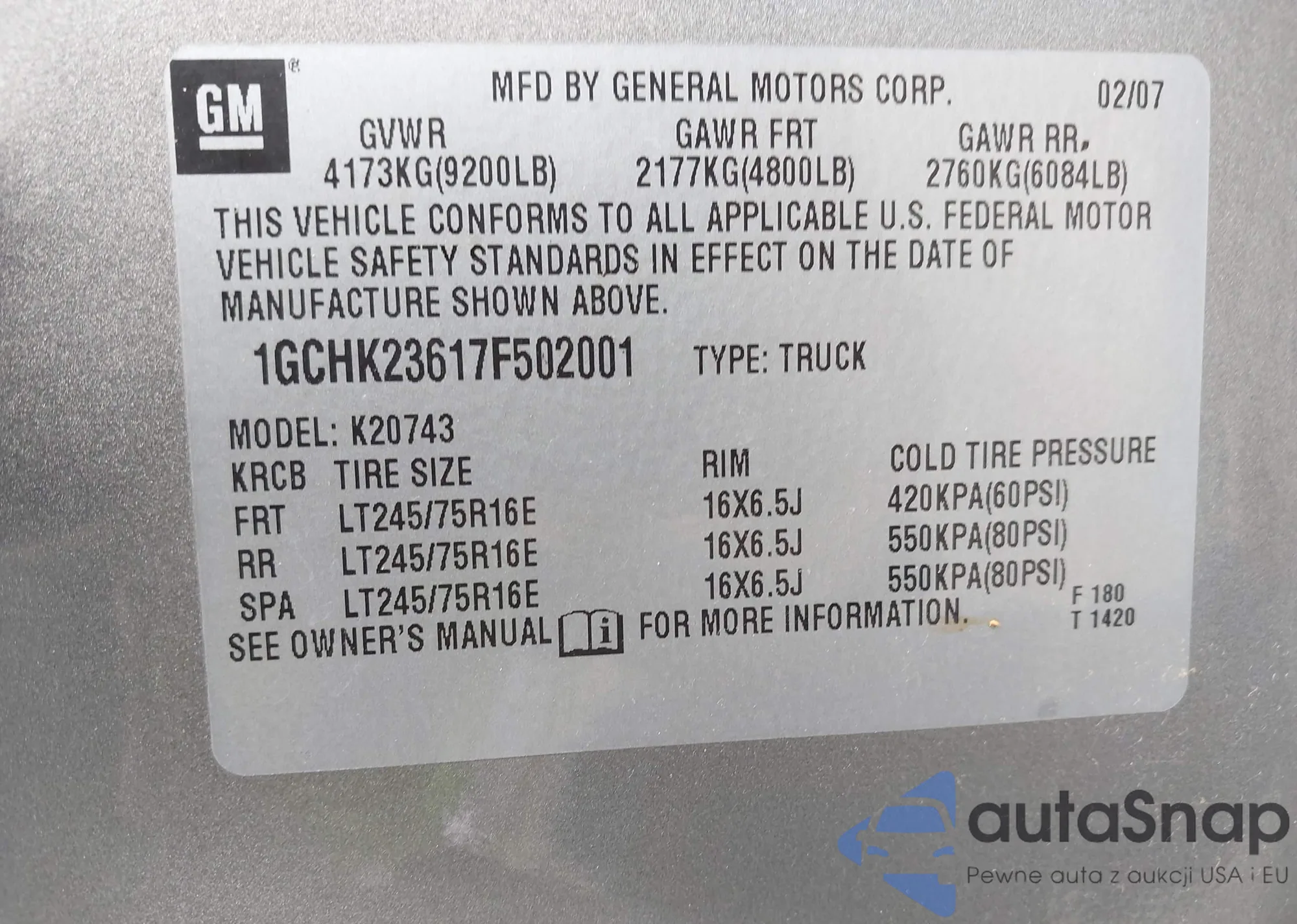 LOT: 43465286 VIN: 1GCHK23617F502001