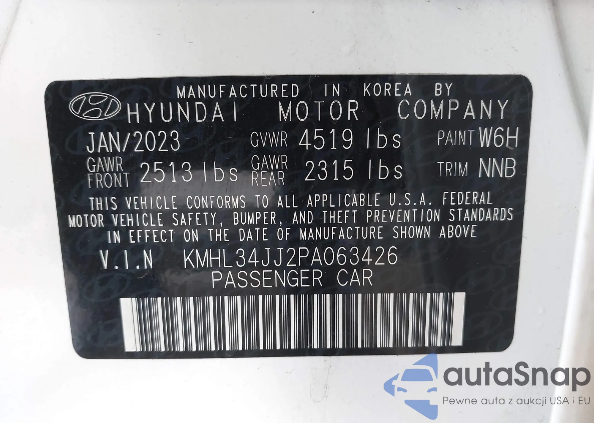 LOT: 43355185 VIN: KMHL34JJ2PA063426