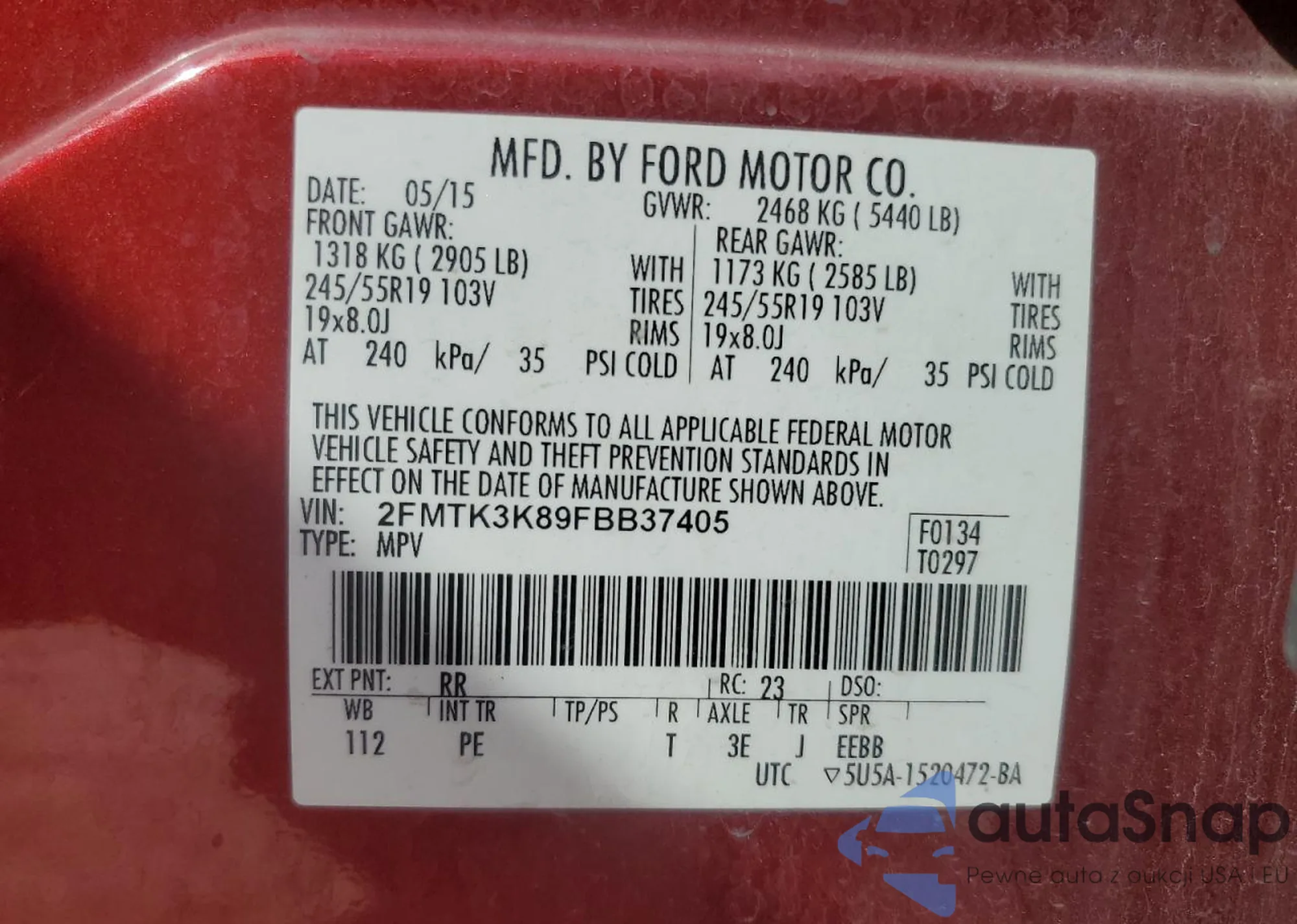 LOT: 90138295 VIN: 2FMTK3K89FBB37405