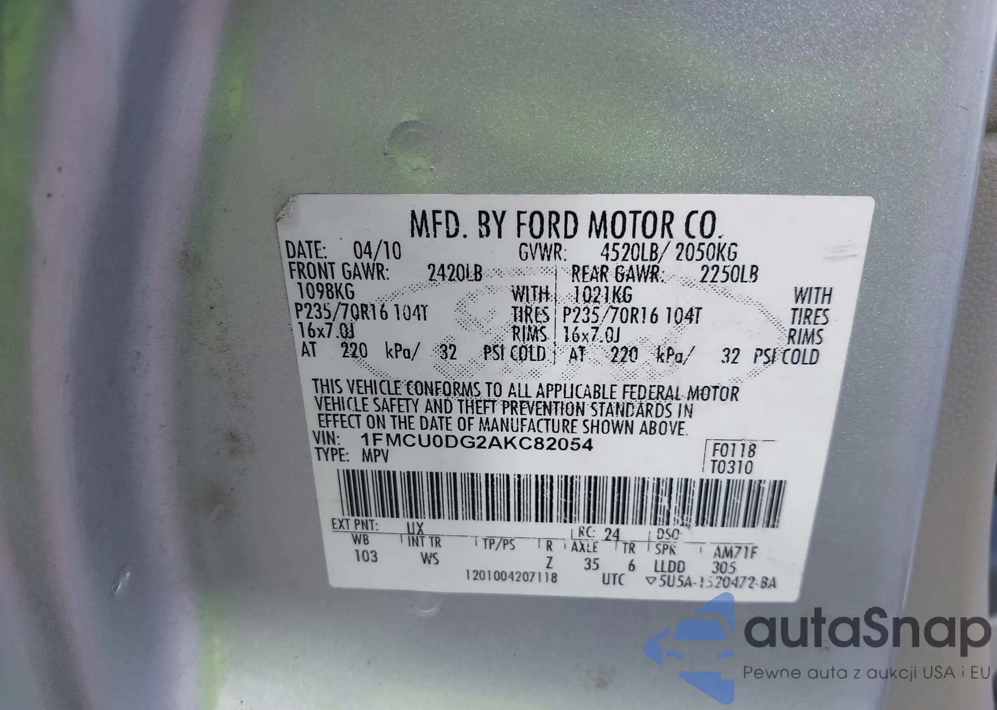• VIN 1FMCU0DG2AKC82054
