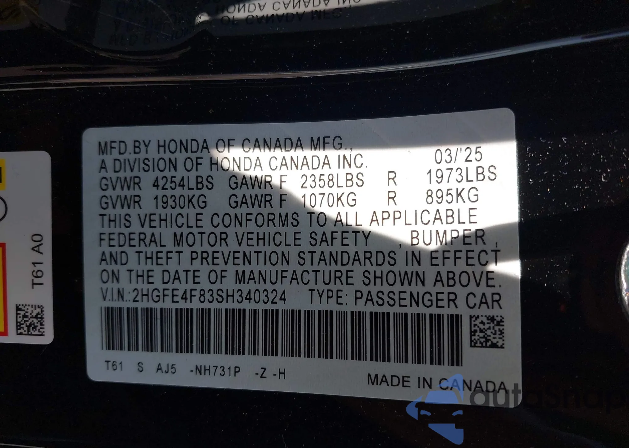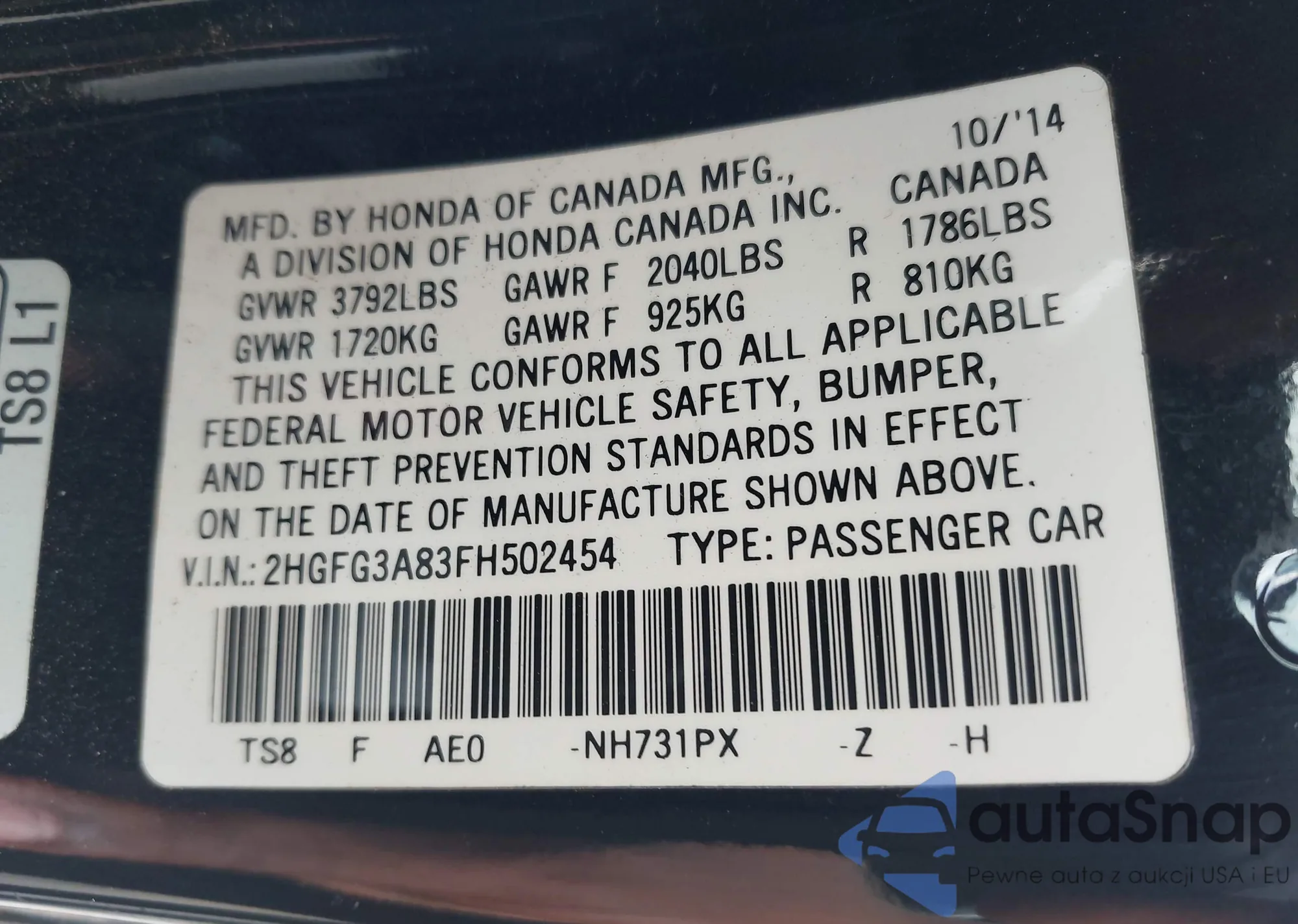• VIN 2HGFG3A83FH502454