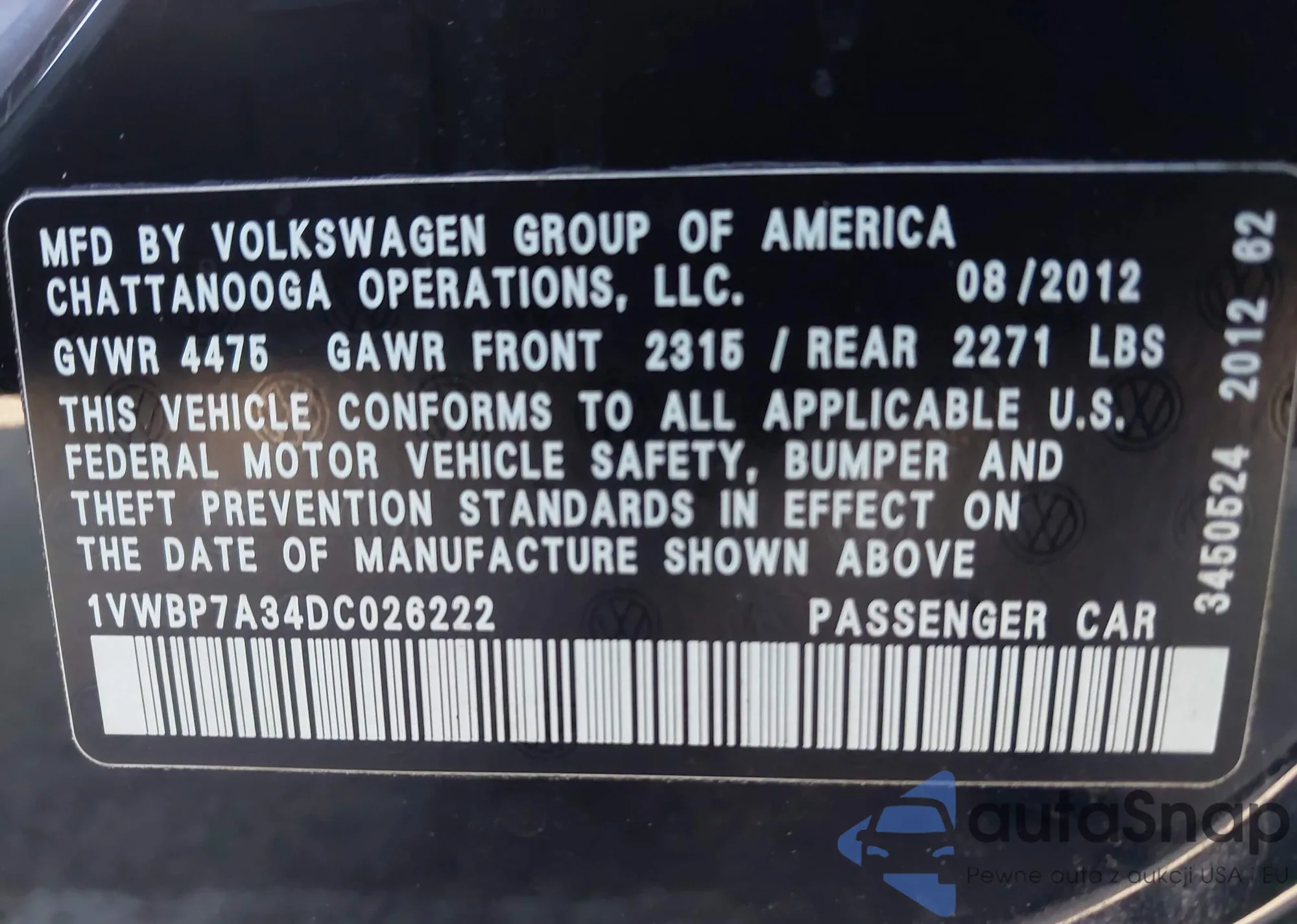 • VIN 1VWBP7A34DC026222