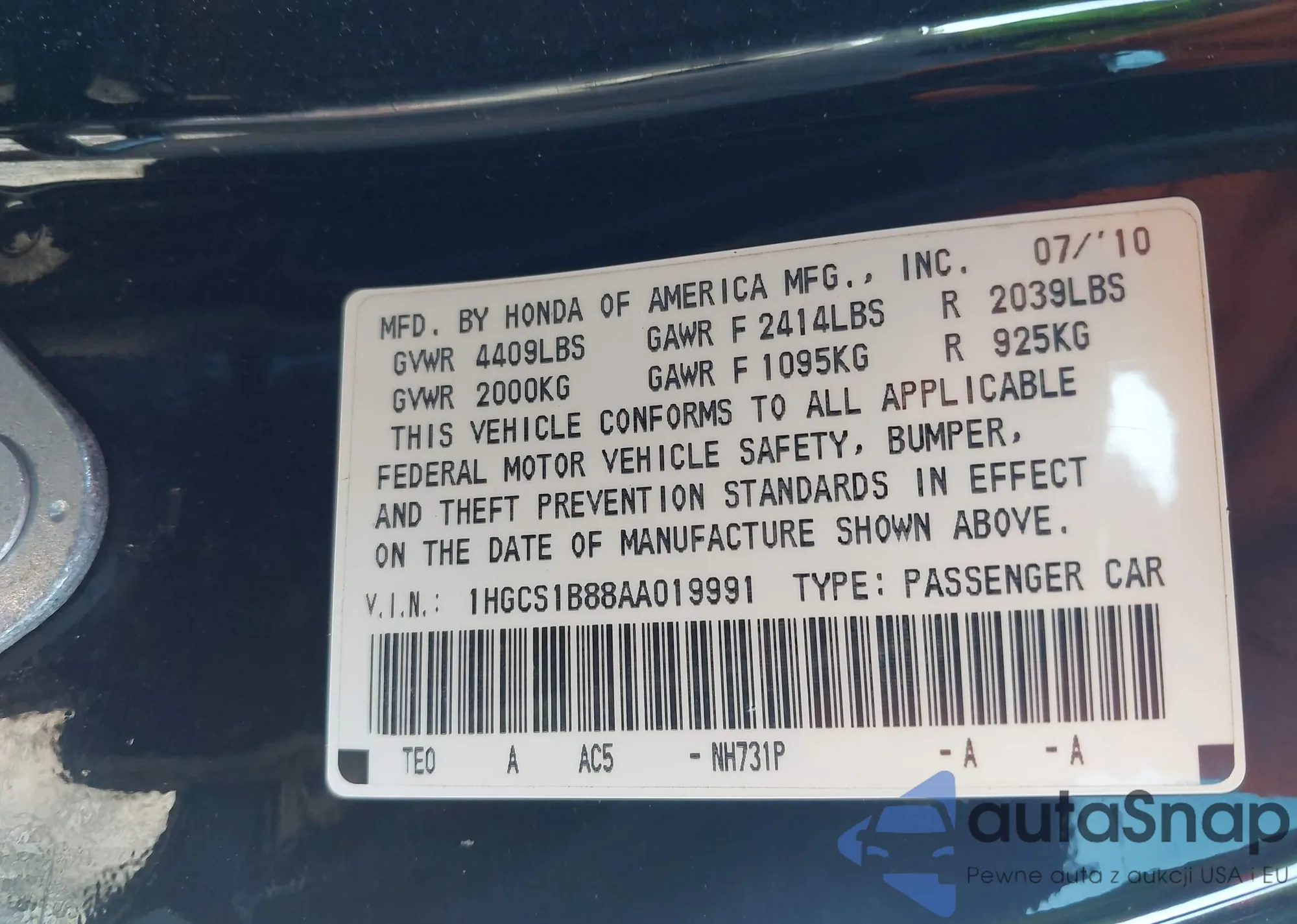 LOT: 43272915 VIN: 1HGCS1B88AA019991