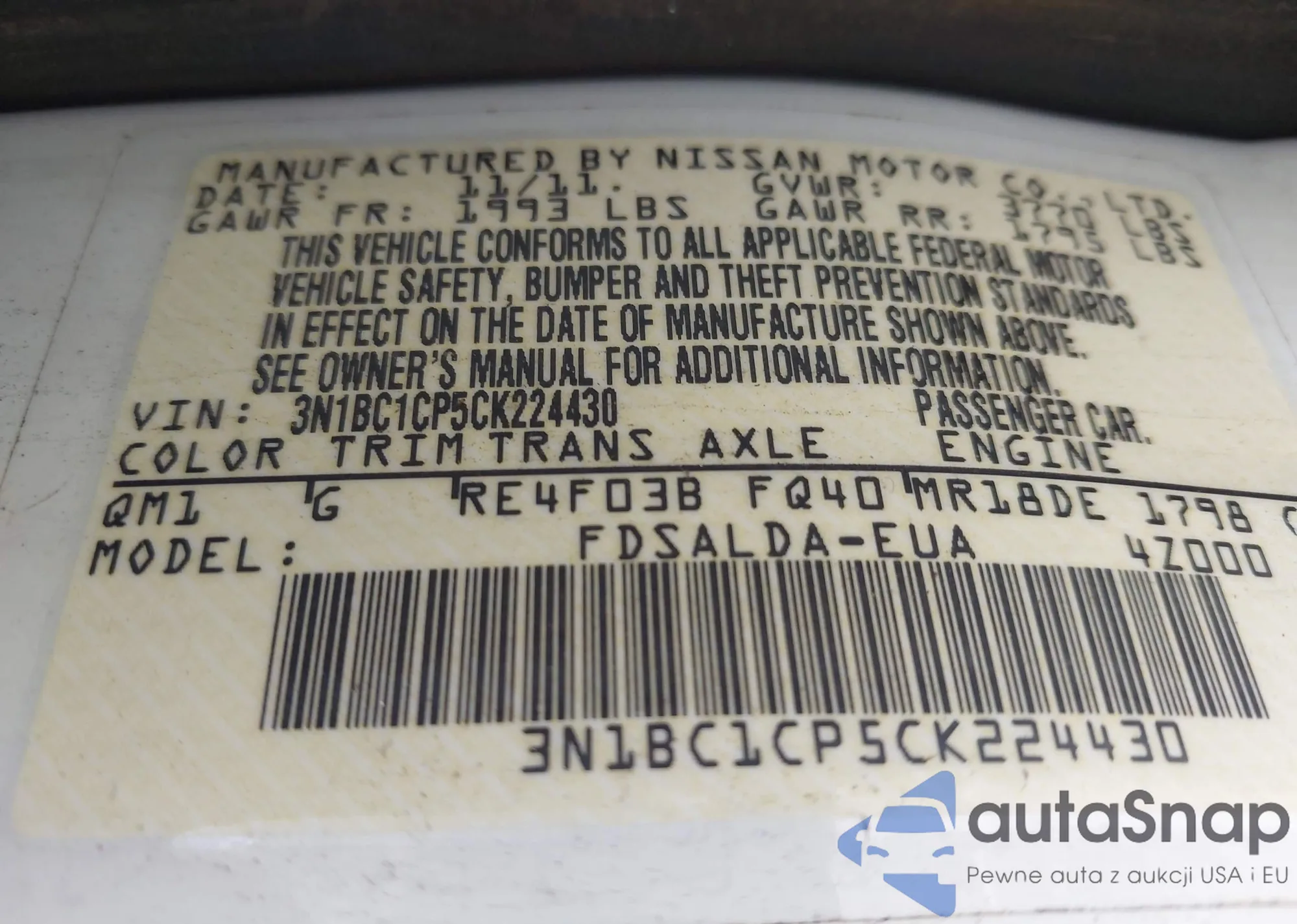 LOT: 43411082 VIN: 3N1BC1CP5CK224430