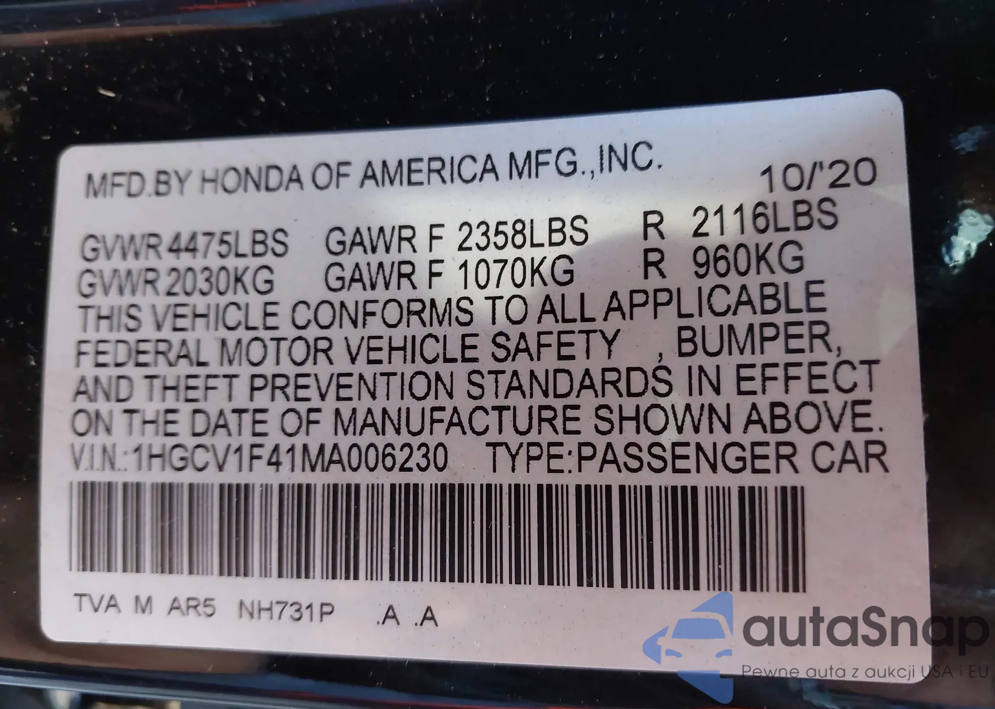 LOT: 43507379 VIN: 1HGCV1F41MA006230