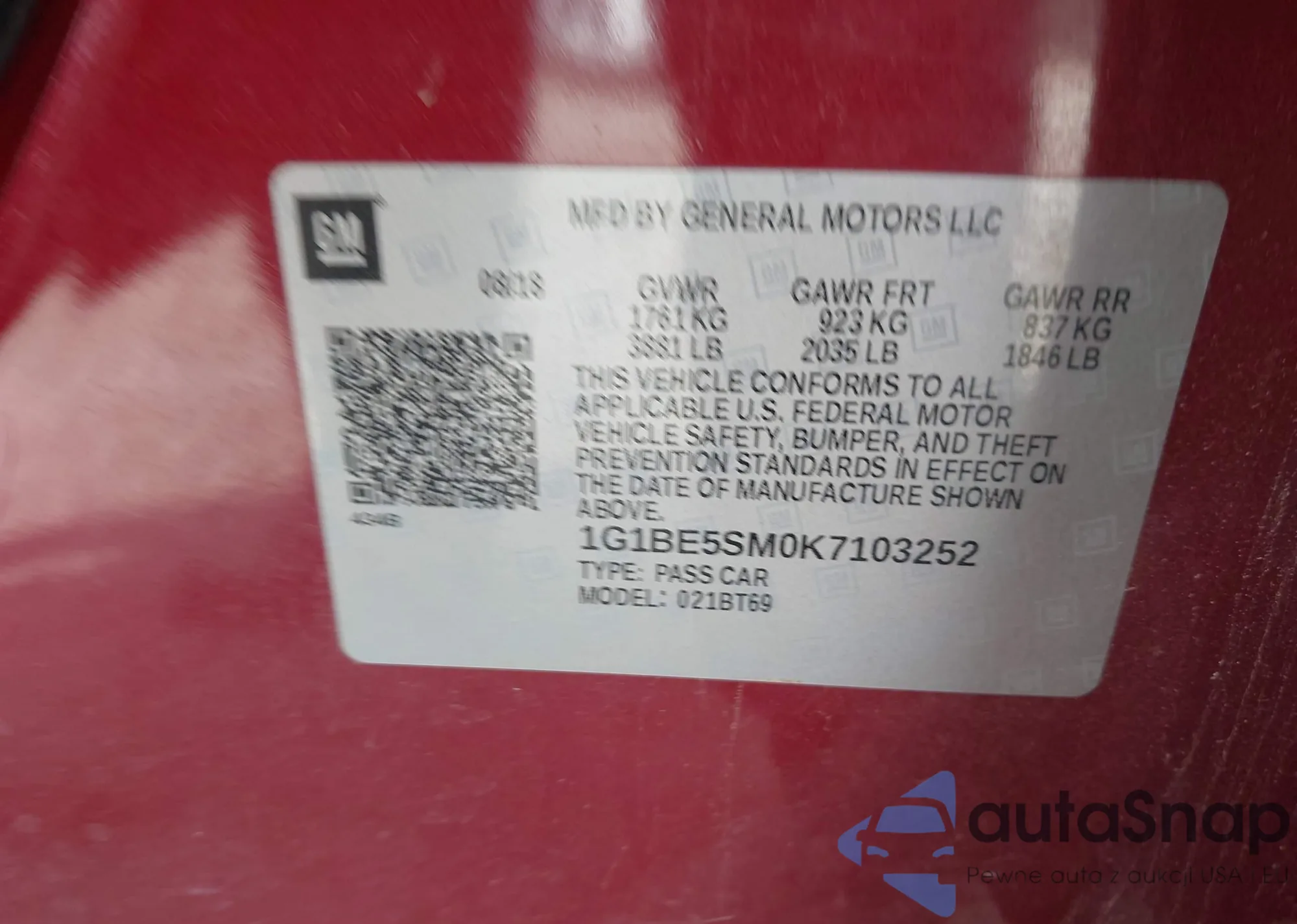 LOT: 43709061 VIN: 1G1BE5SM0K7103252