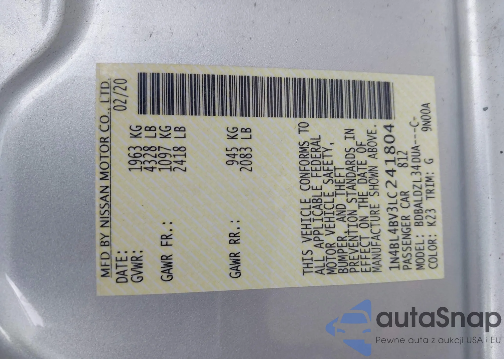 LOT: 43473827 VIN: 1N4BL4BV3LC241804