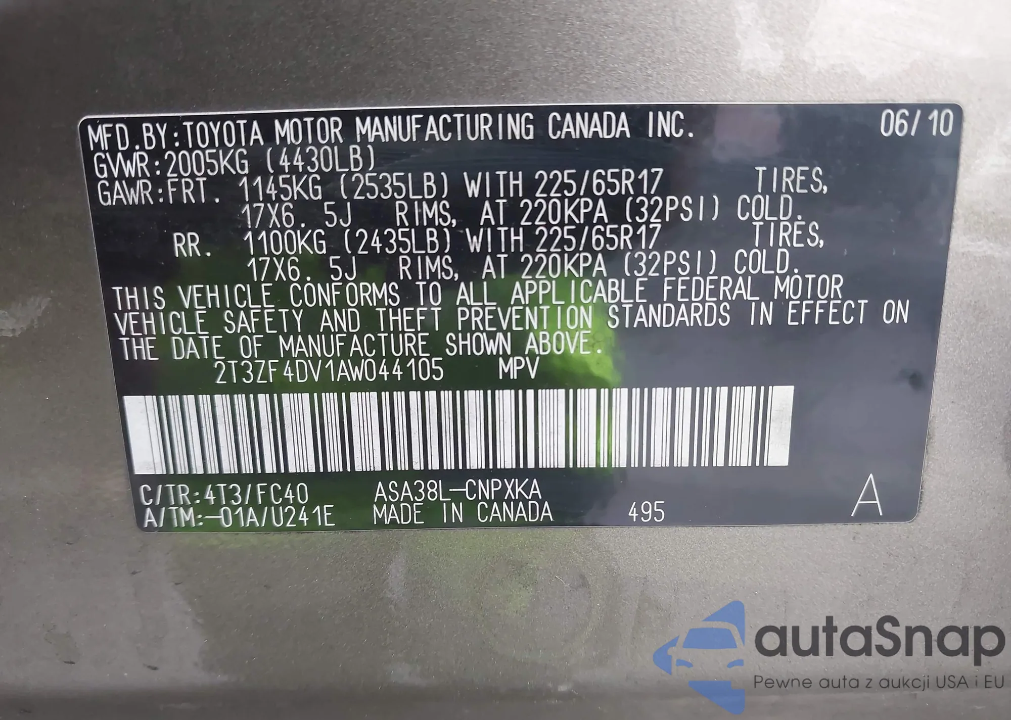 • VIN 2T3ZF4DV1AW044105