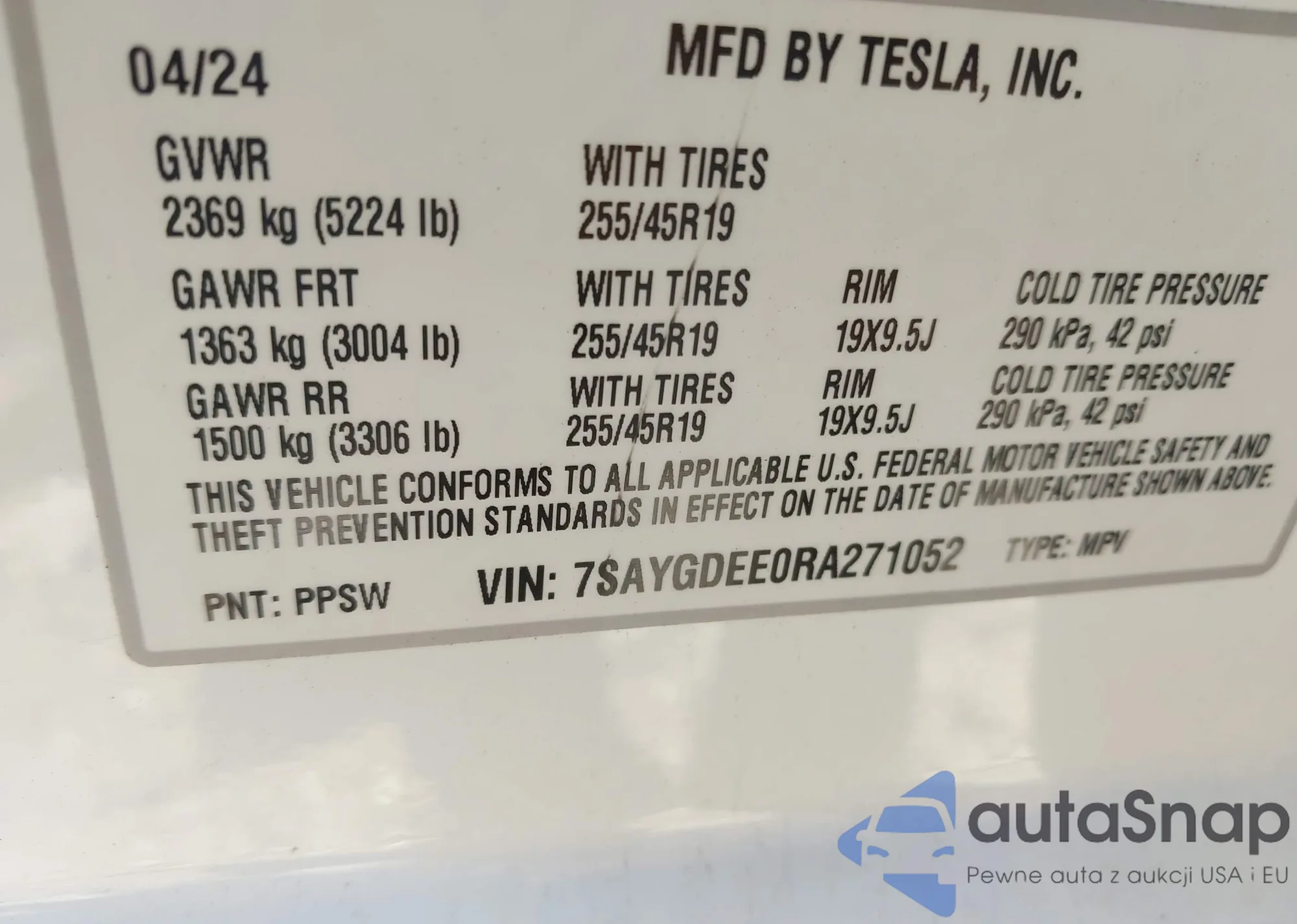 LOT: 43408483 VIN: 7SAYGDEE0RA271052