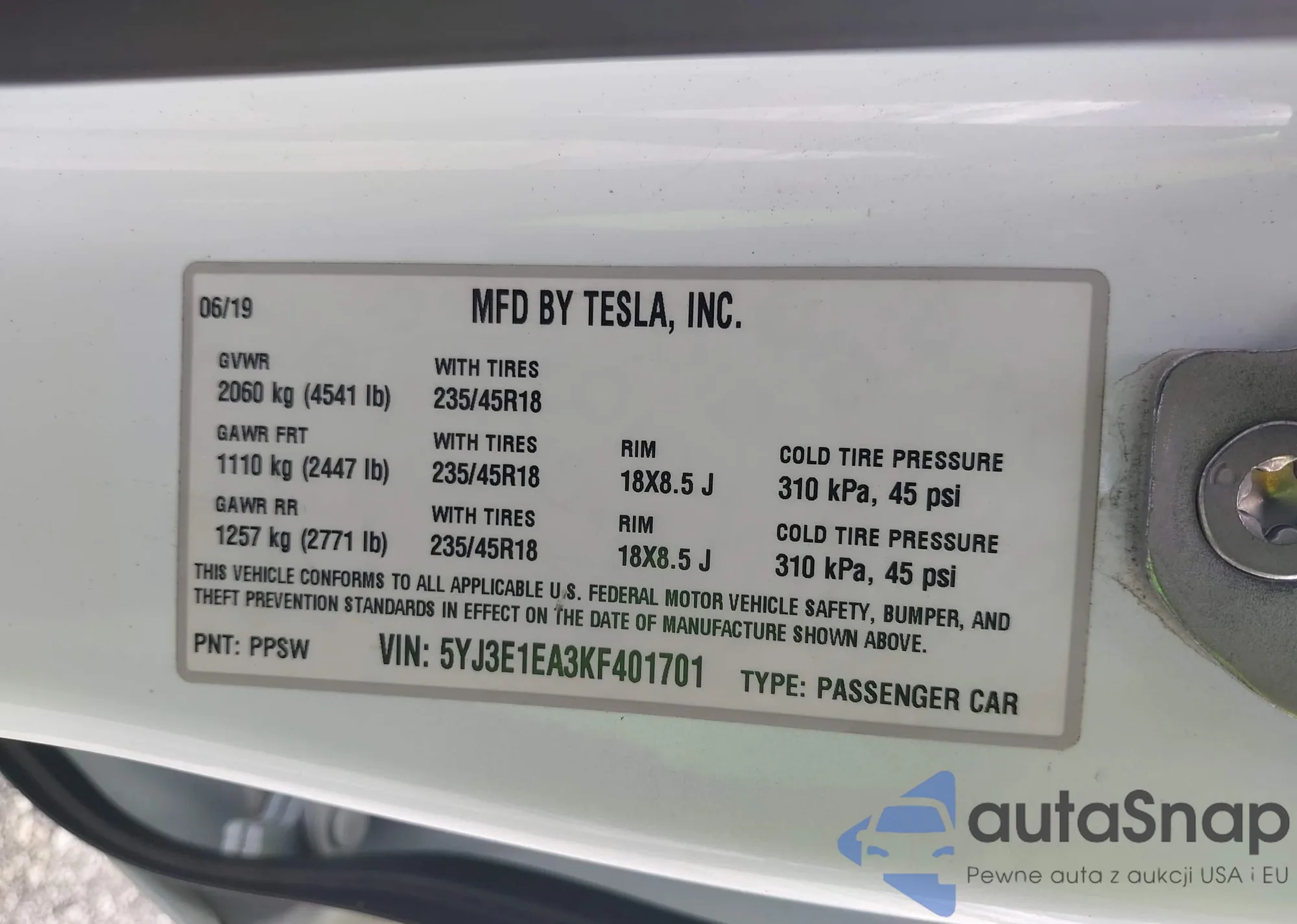 • VIN 5YJ3E1EA3KF401701