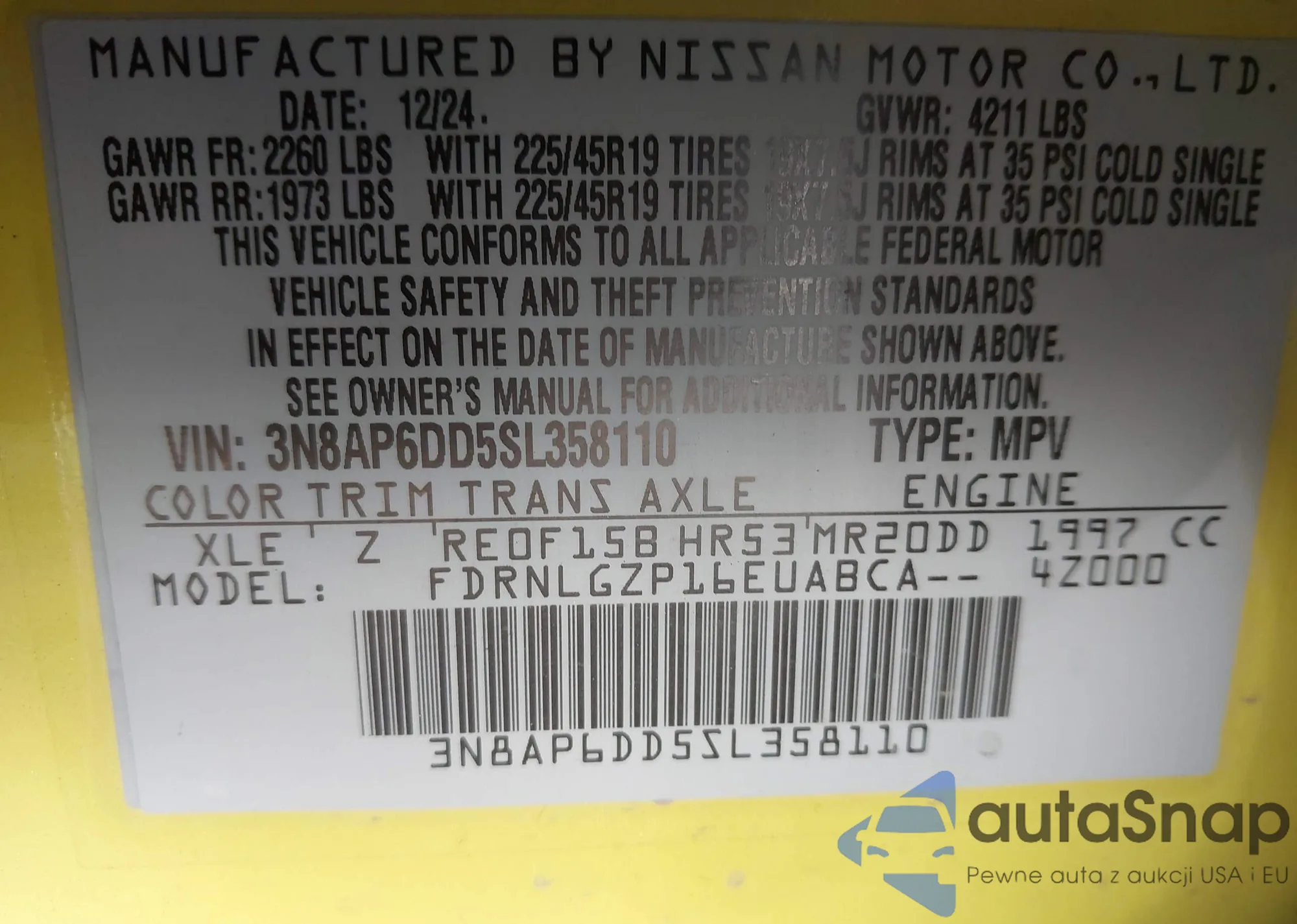 • VIN 3N8AP6DD5SL358110