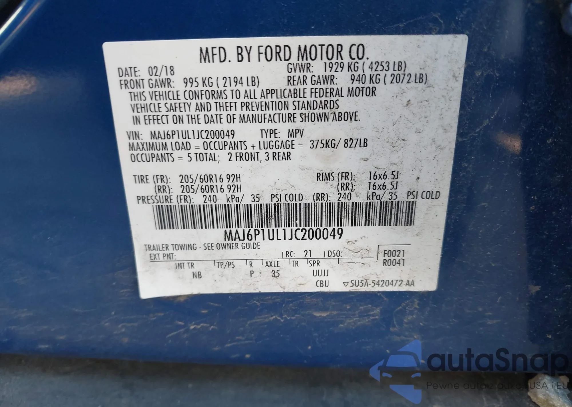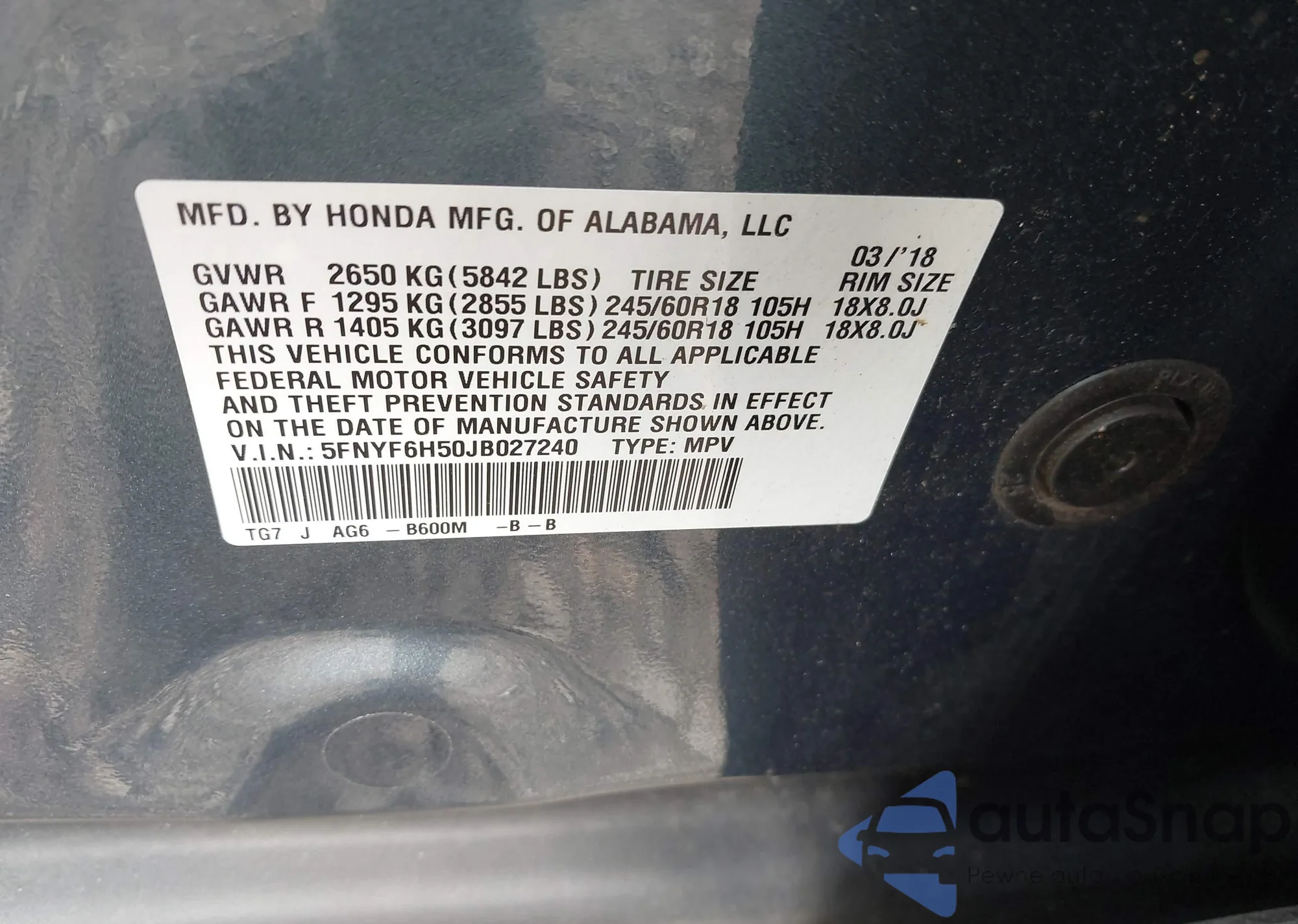 • VIN 5FNYF6H50JB027240