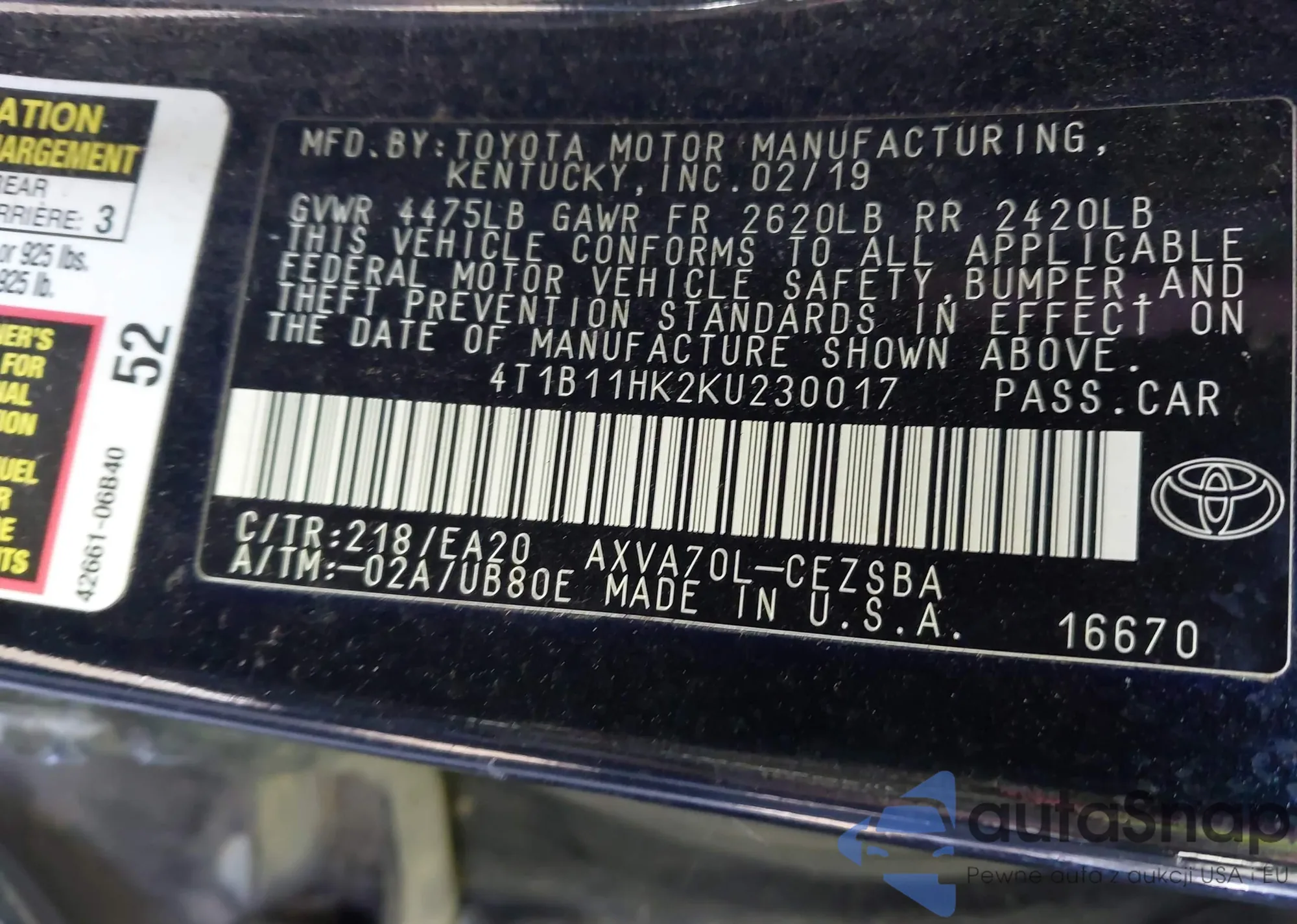 • VIN 4T1B11HK2KU230017