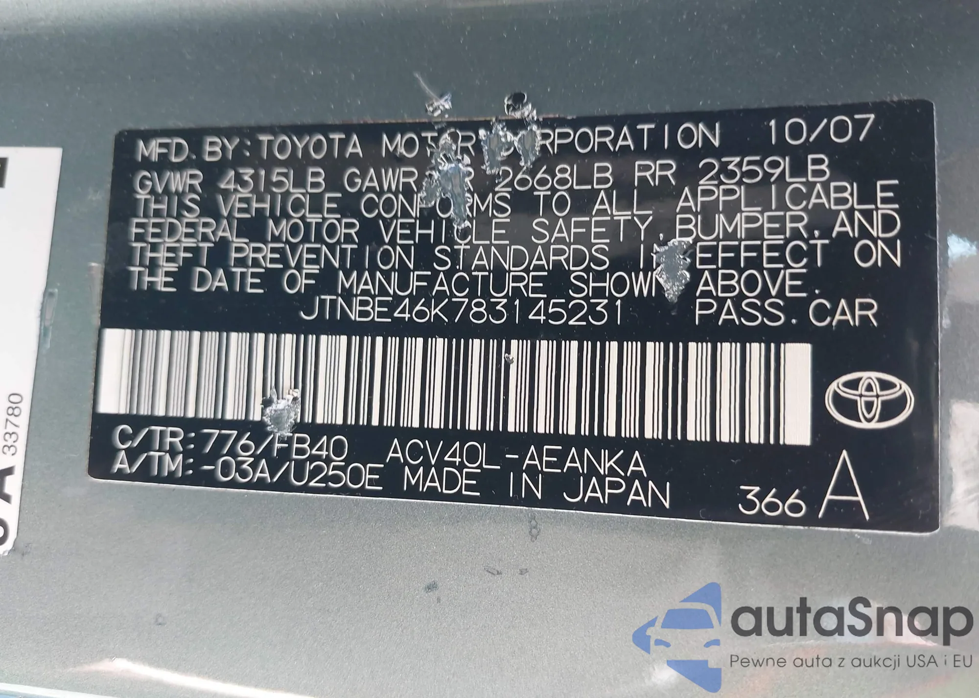 LOT: 43249300 VIN: JTNBE46K783145231