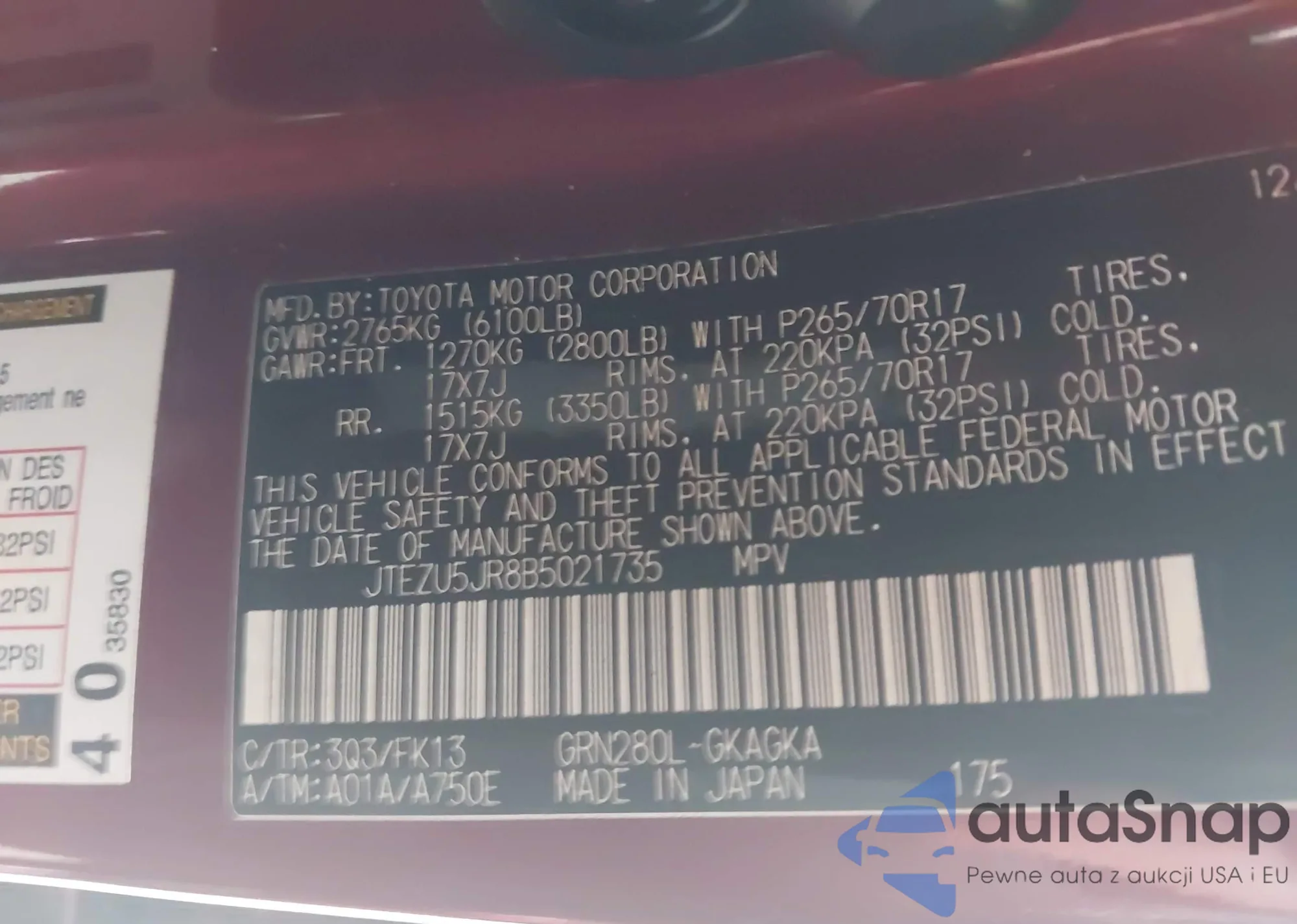 LOT: 43621976 VIN: JTEZU5JR8B5021735