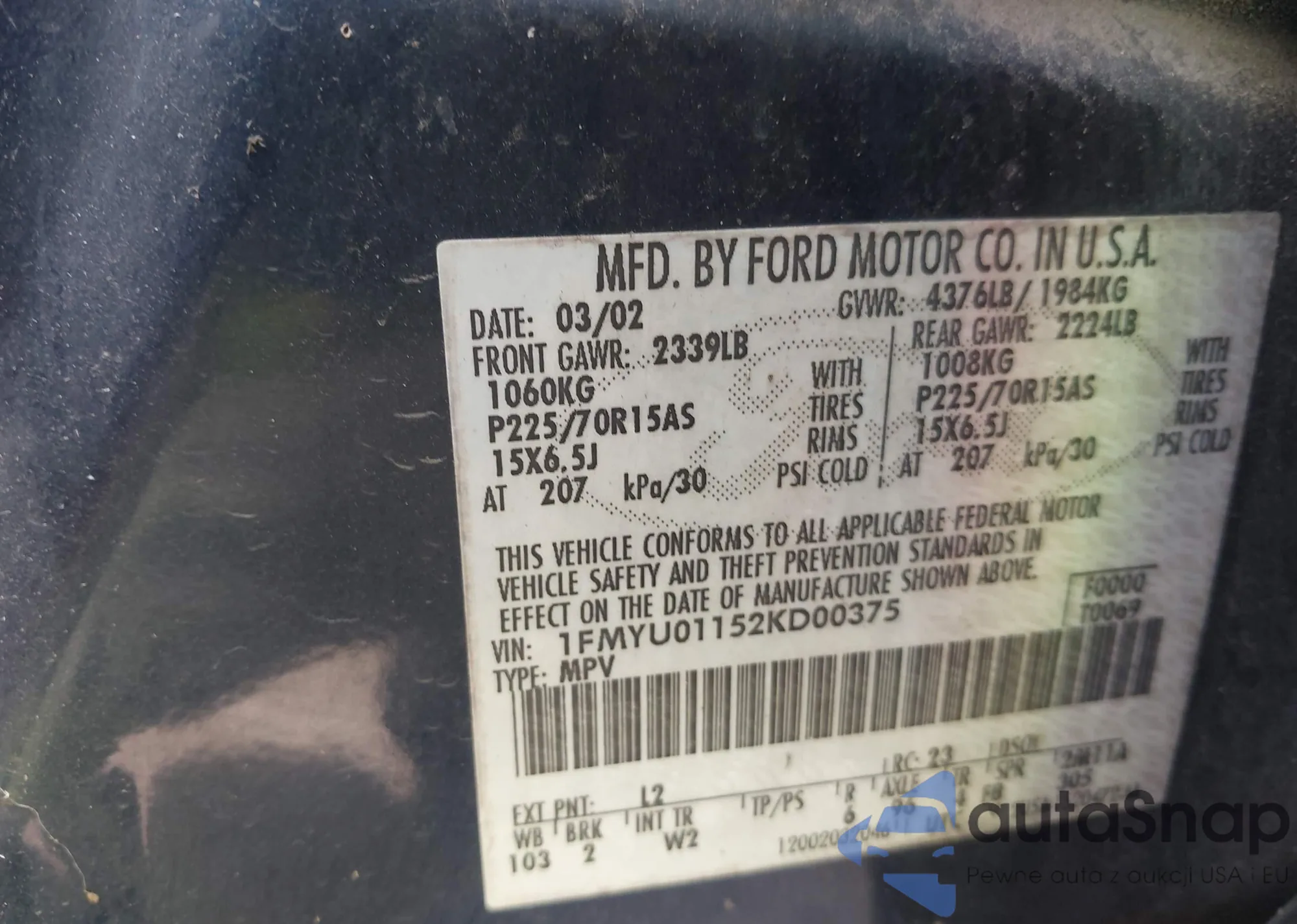 LOT: 43711923 VIN: 1FMYU01152KD00375