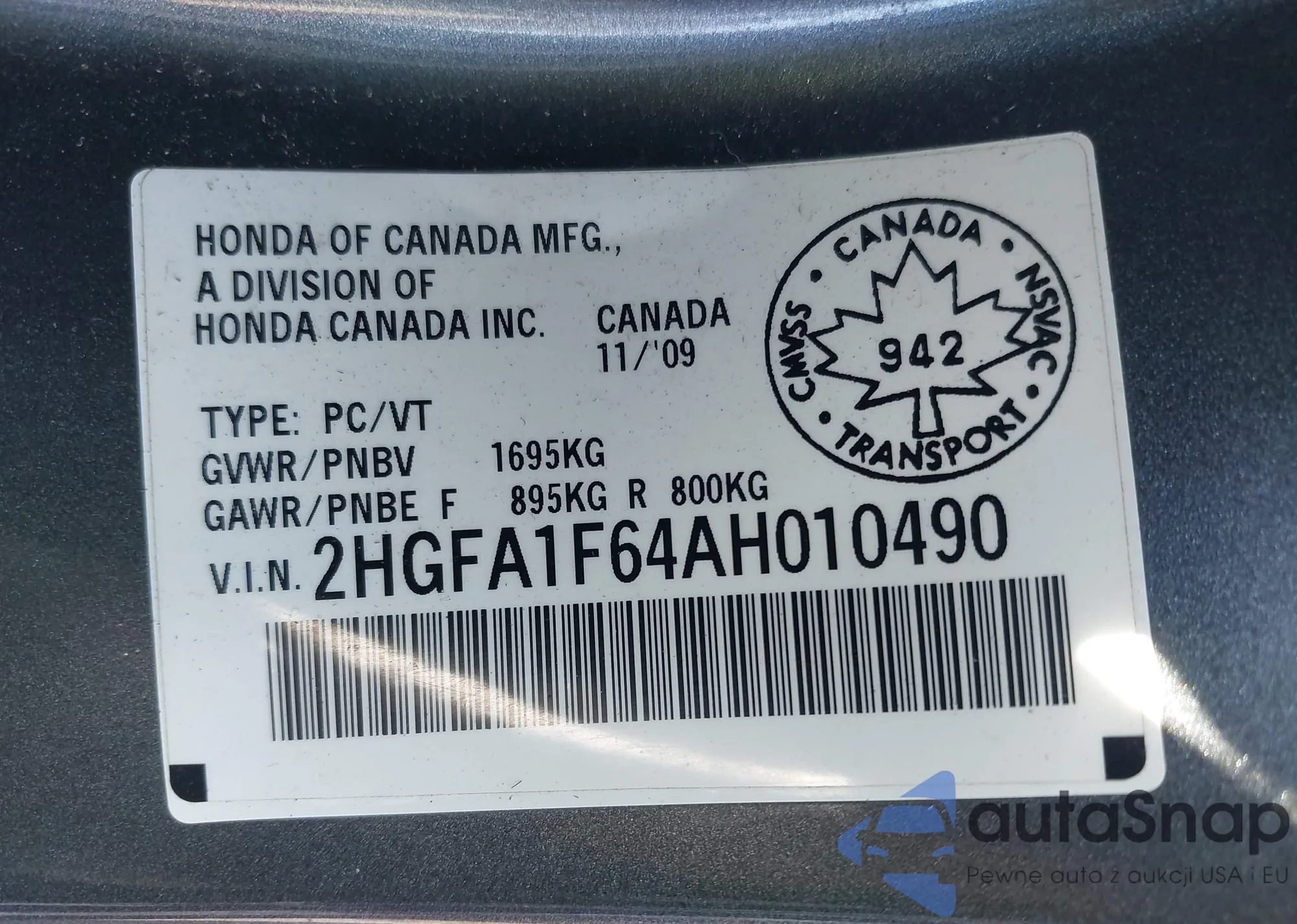 • VIN 2HGFA1F64AH010490