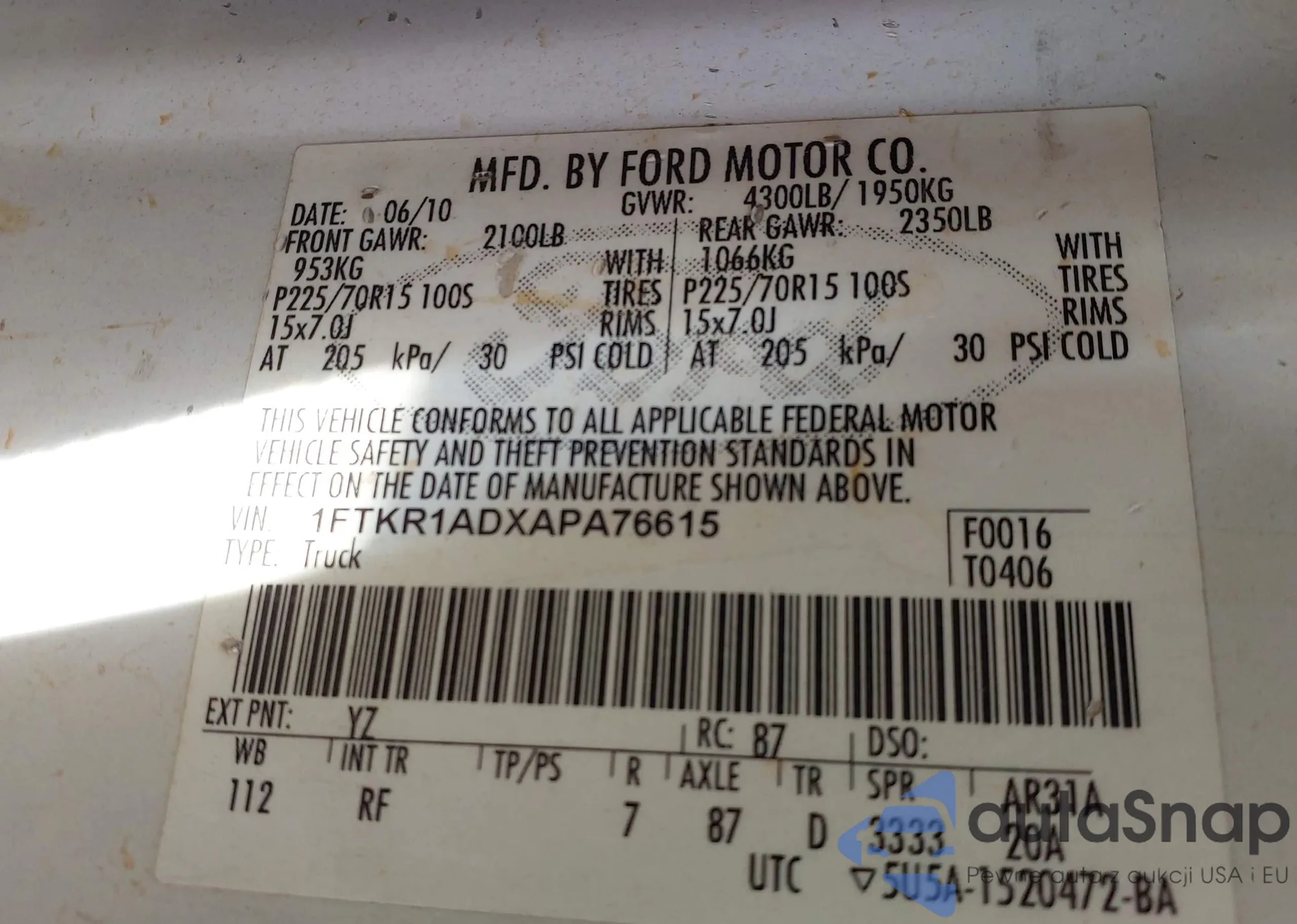LOT: 43494356 VIN: 1FTKR1ADXAPA76615