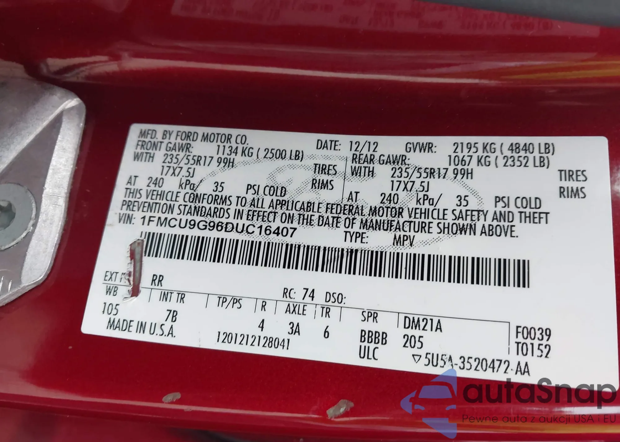 LOT: 43581210 VIN: 1FMCU9G96DUC16407