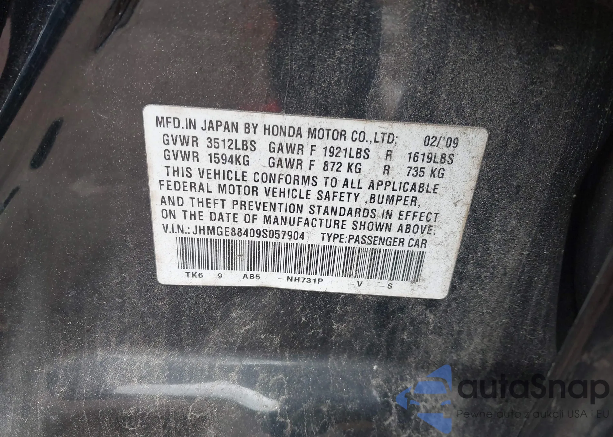 LOT: 43591359 VIN: JHMGE88409S057904