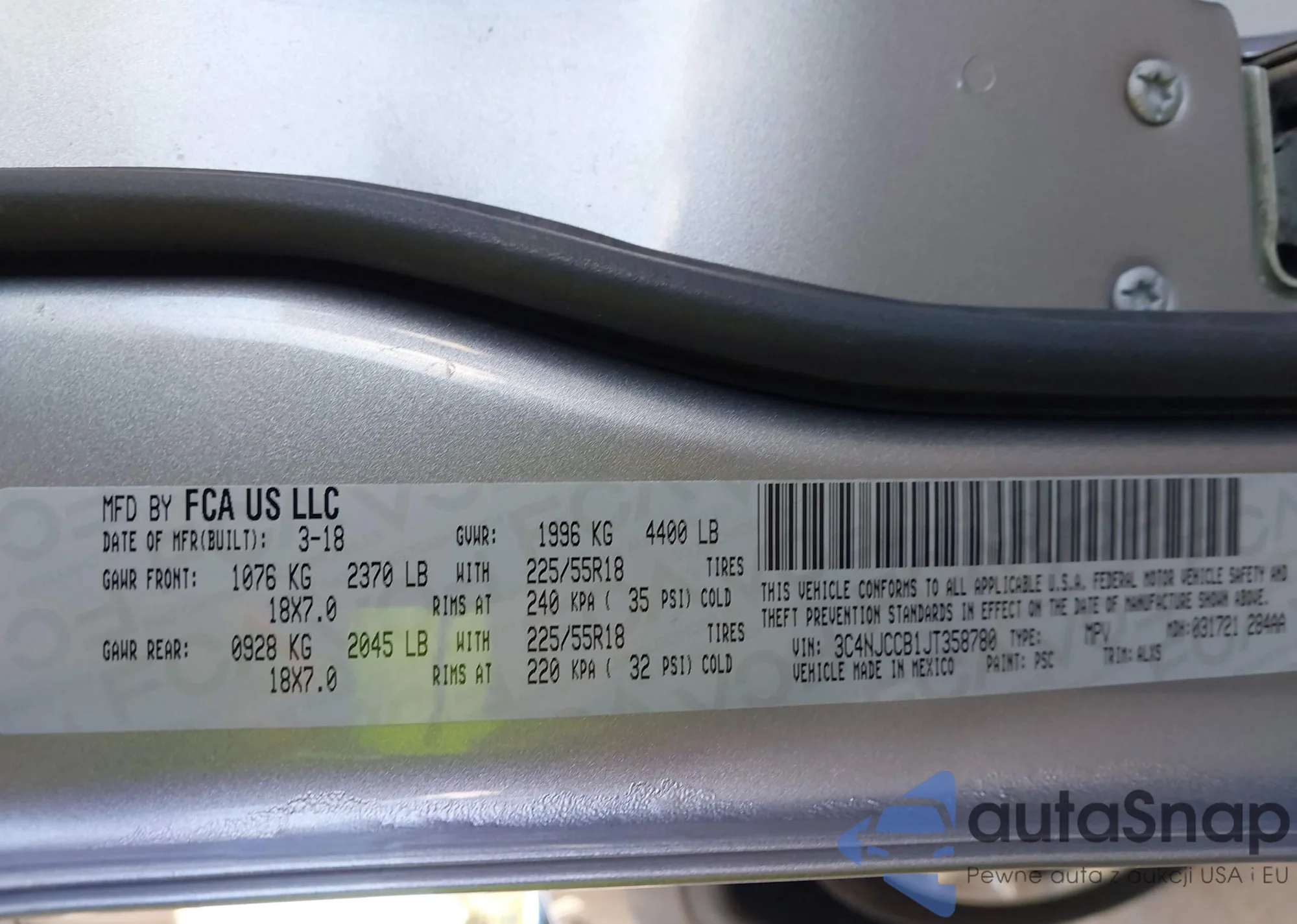 LOT: 43605041 VIN: 3C4NJCCB1JT358780